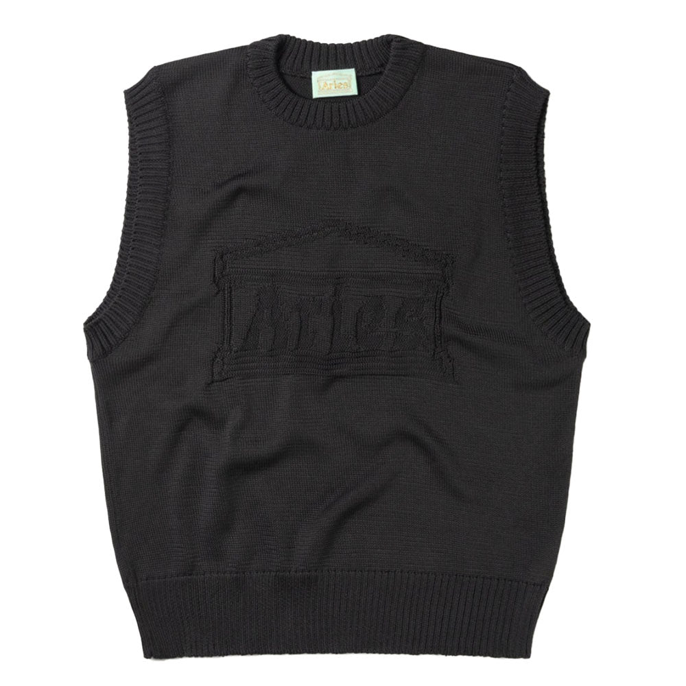 Crew neck loose-fitting sweater vest knitted from recycled polyester yarn, with a reverse-stitch Aries Temple logo on the front.