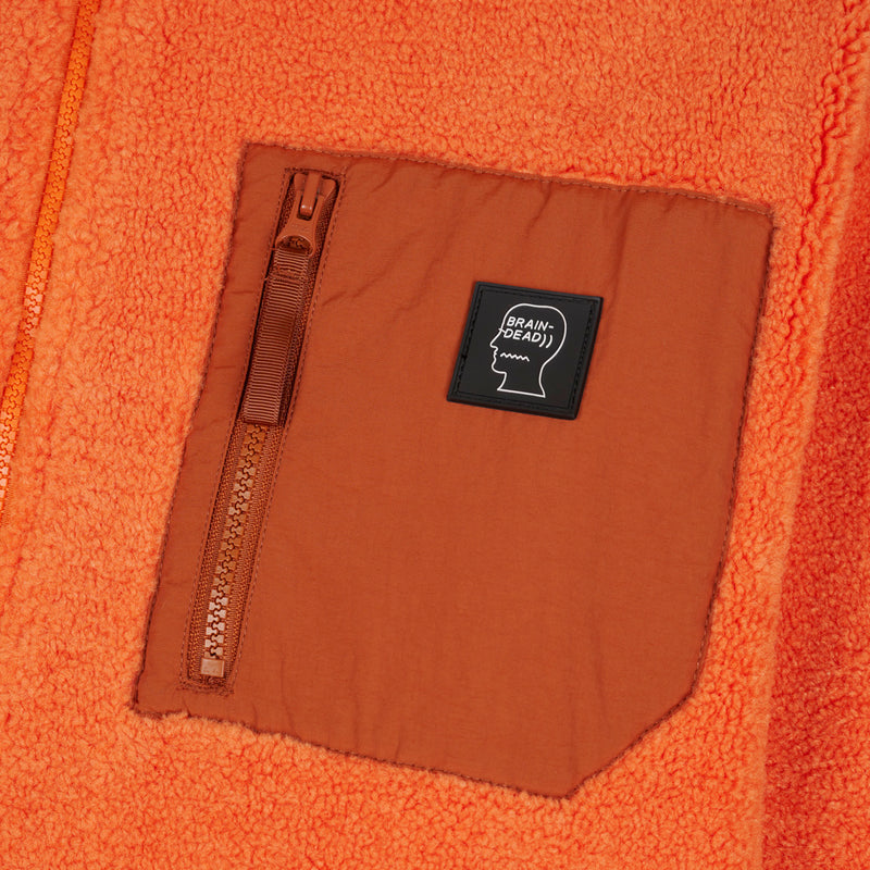 Our sherpa hunting jacket with nylon contrast hood and layered Brain Dead typography panel. Material: Polyester / Nylon
