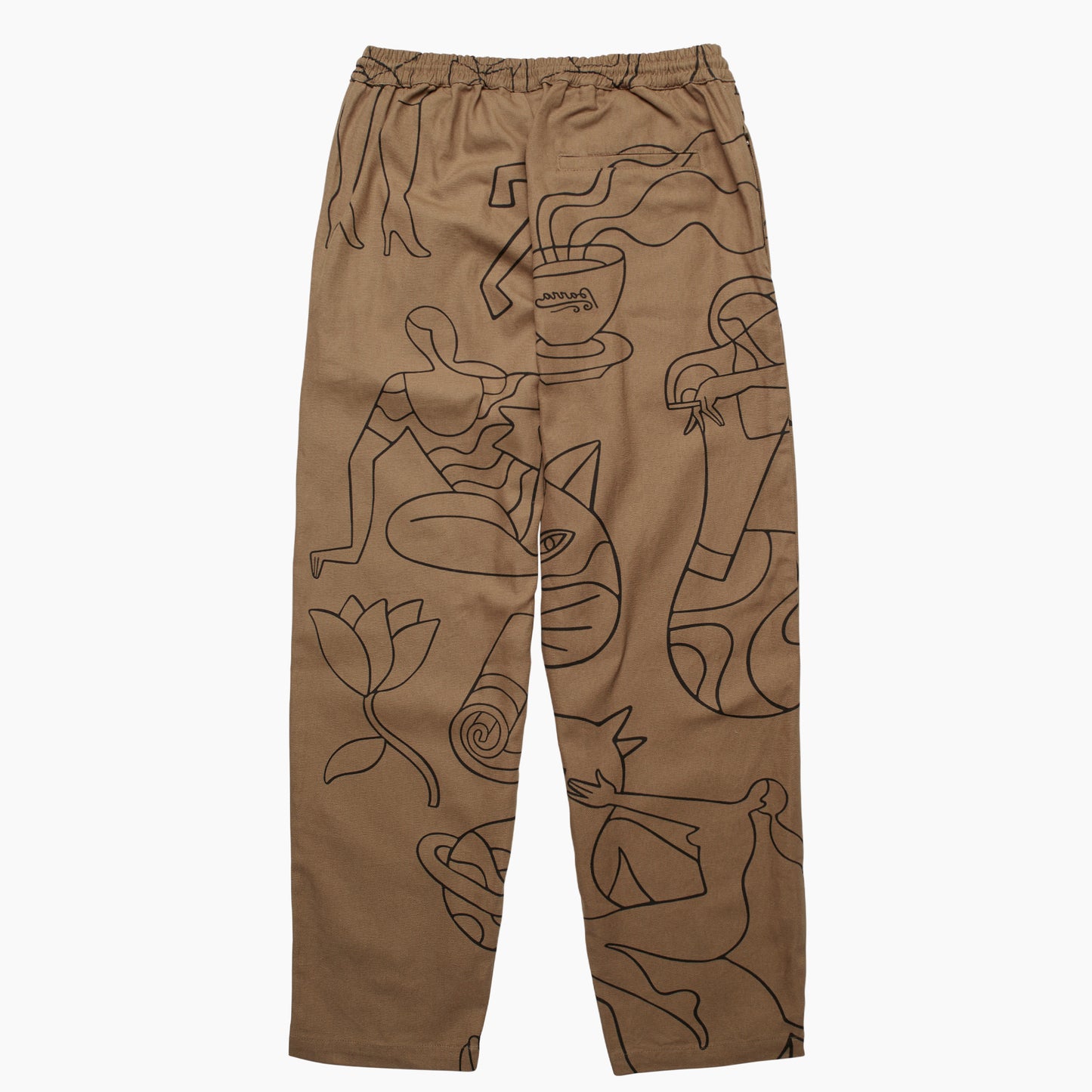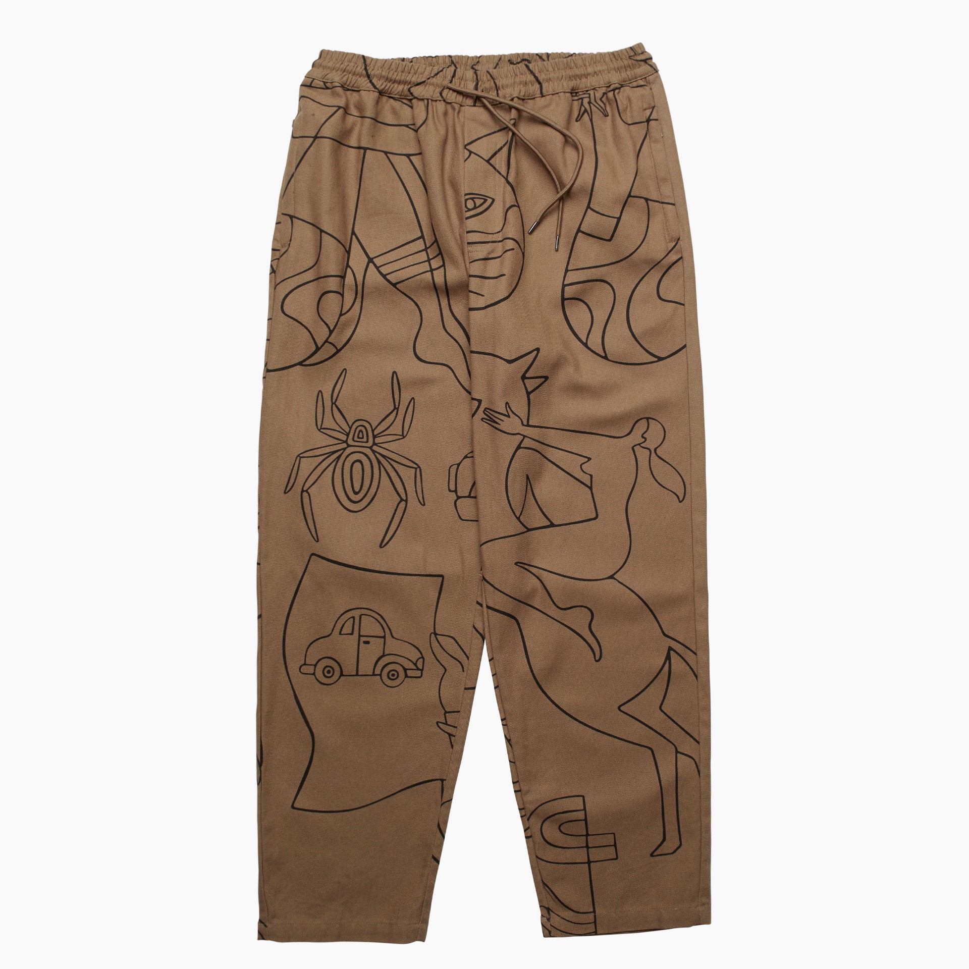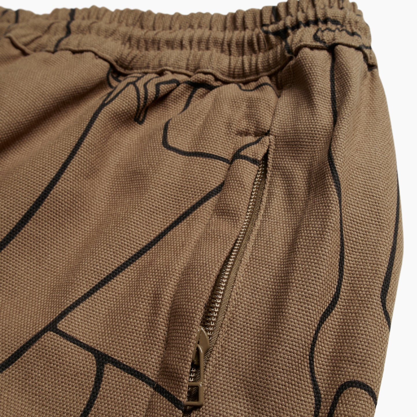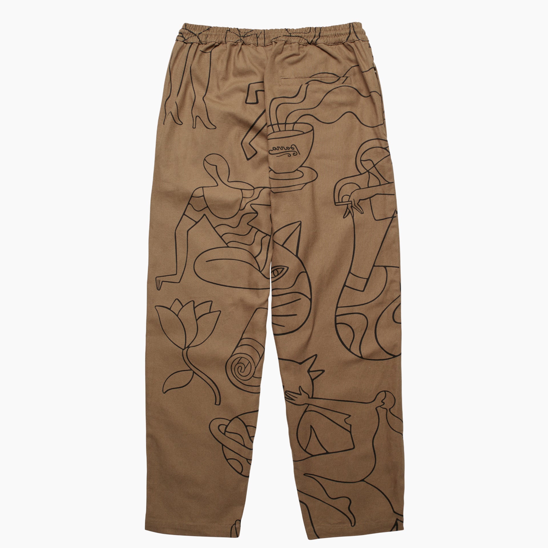 -made from an 100% canvas cotton -random allover printed -elastic waist with drawcord -two zippered side pockets -one back pocket -relaxed fit -matching the jacket -cold wash, do not tumble dry -every piece is uniquely printed made in China