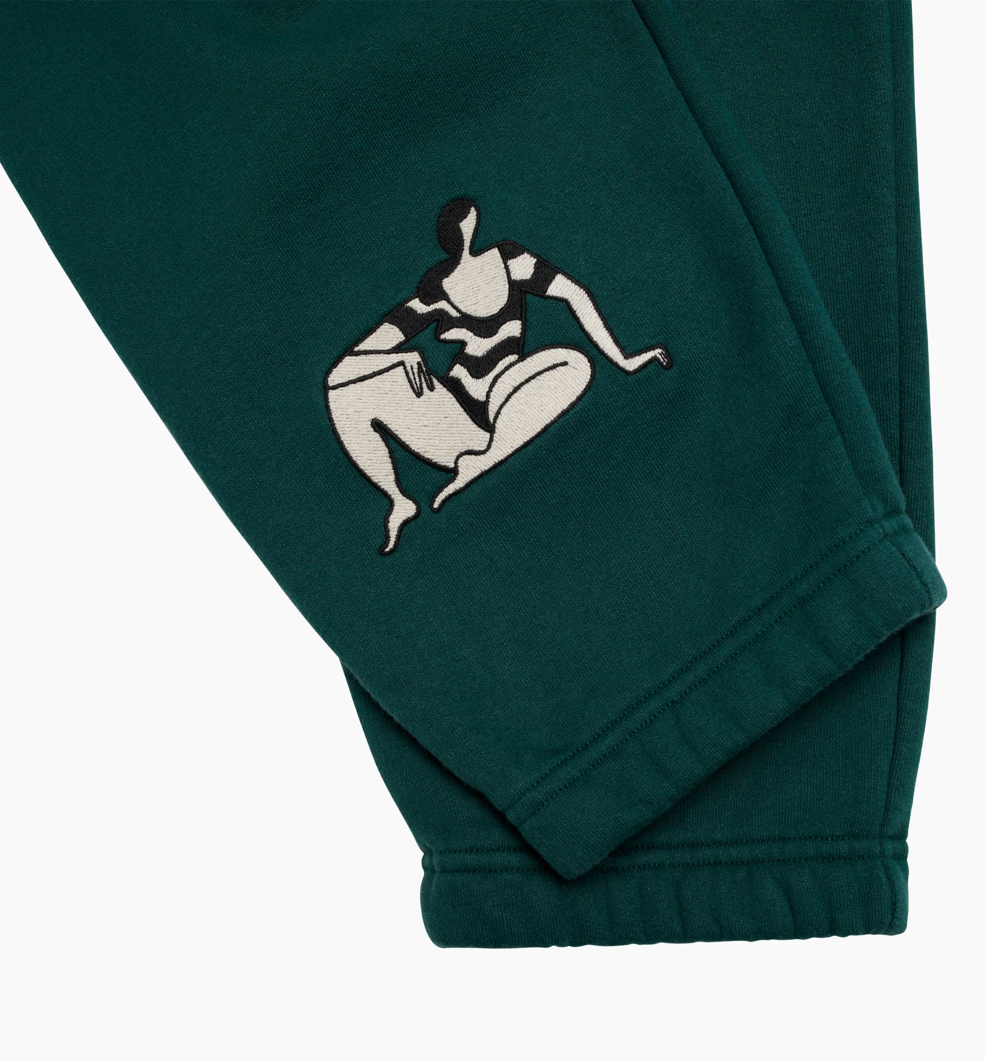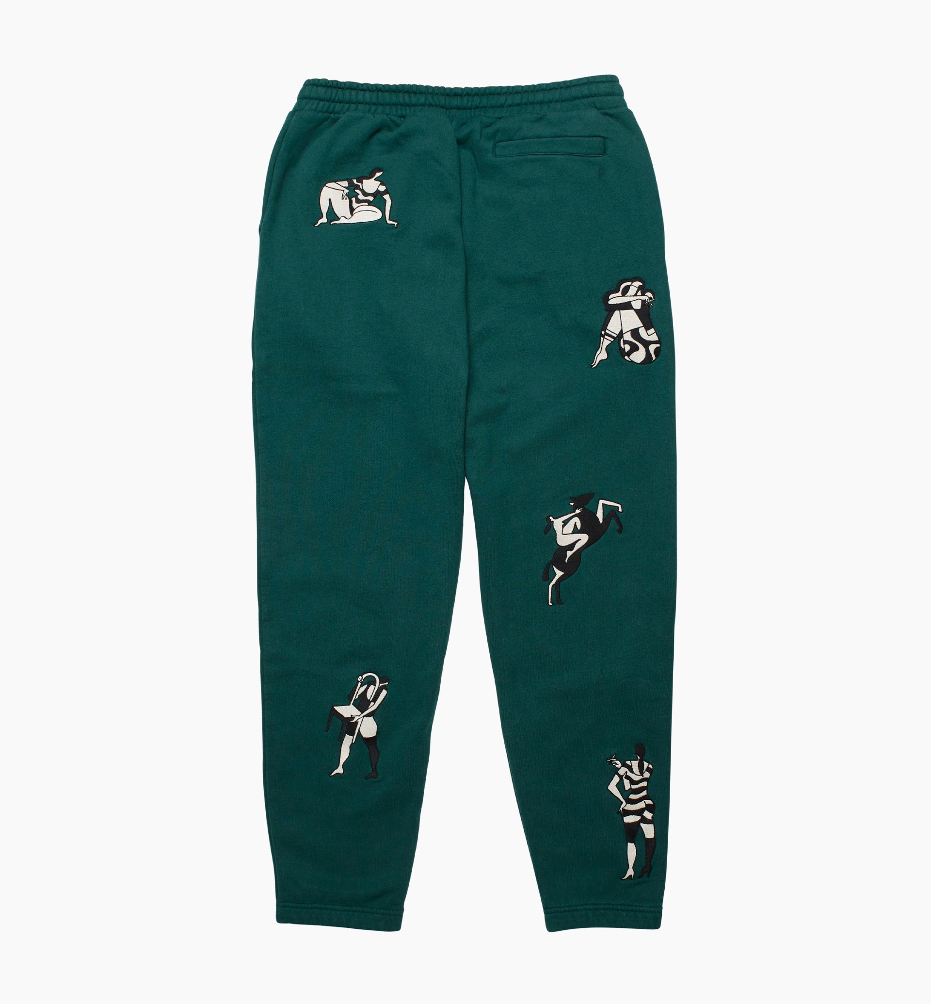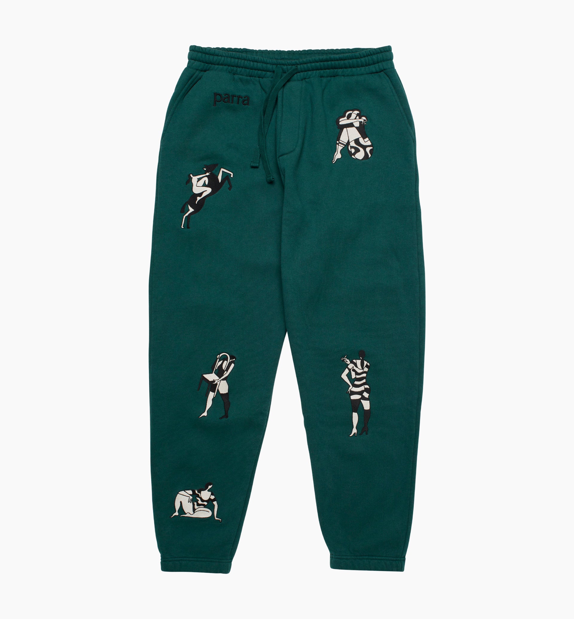-custom cut silhouette, relaxed fit -poly cotton, 450 grams/m2 -five different embroideries all over -parra embroidery at the front -half brushed inside -eco pre washed with zero shrinkage -dry touch finish -two side pockets and one back pocket -elastic leg cuffs and waistband -tonal drawcord -fits true to size, take your normal size -machine wash inside out at 30°, do not tumble dry made in Portugal