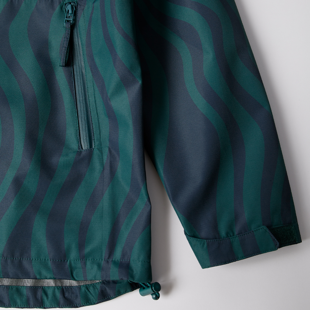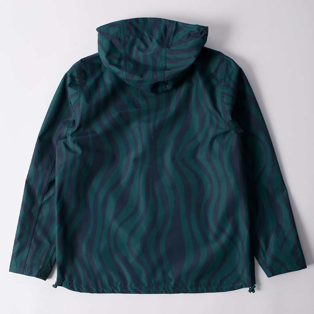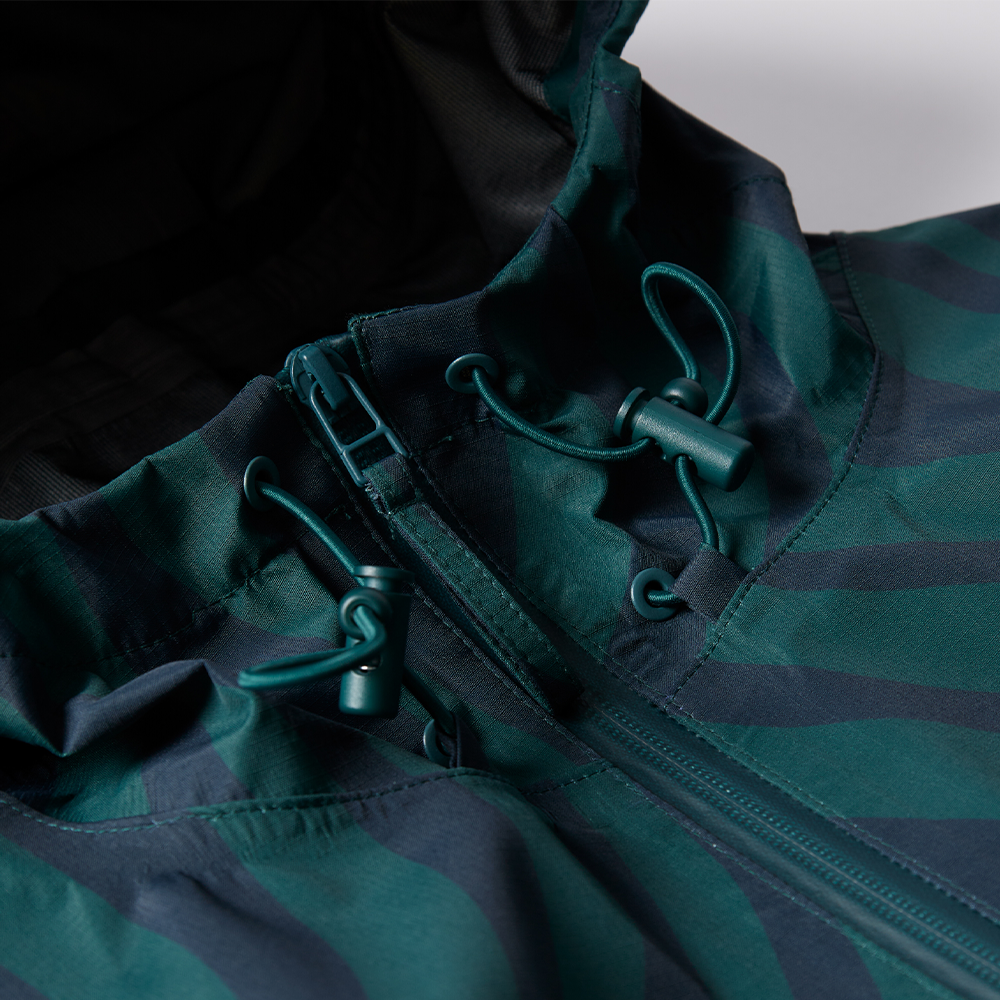 Waterproof rain jacket, all over printed with the Rain flow artwork. Parra printed in 3D rubber at chest