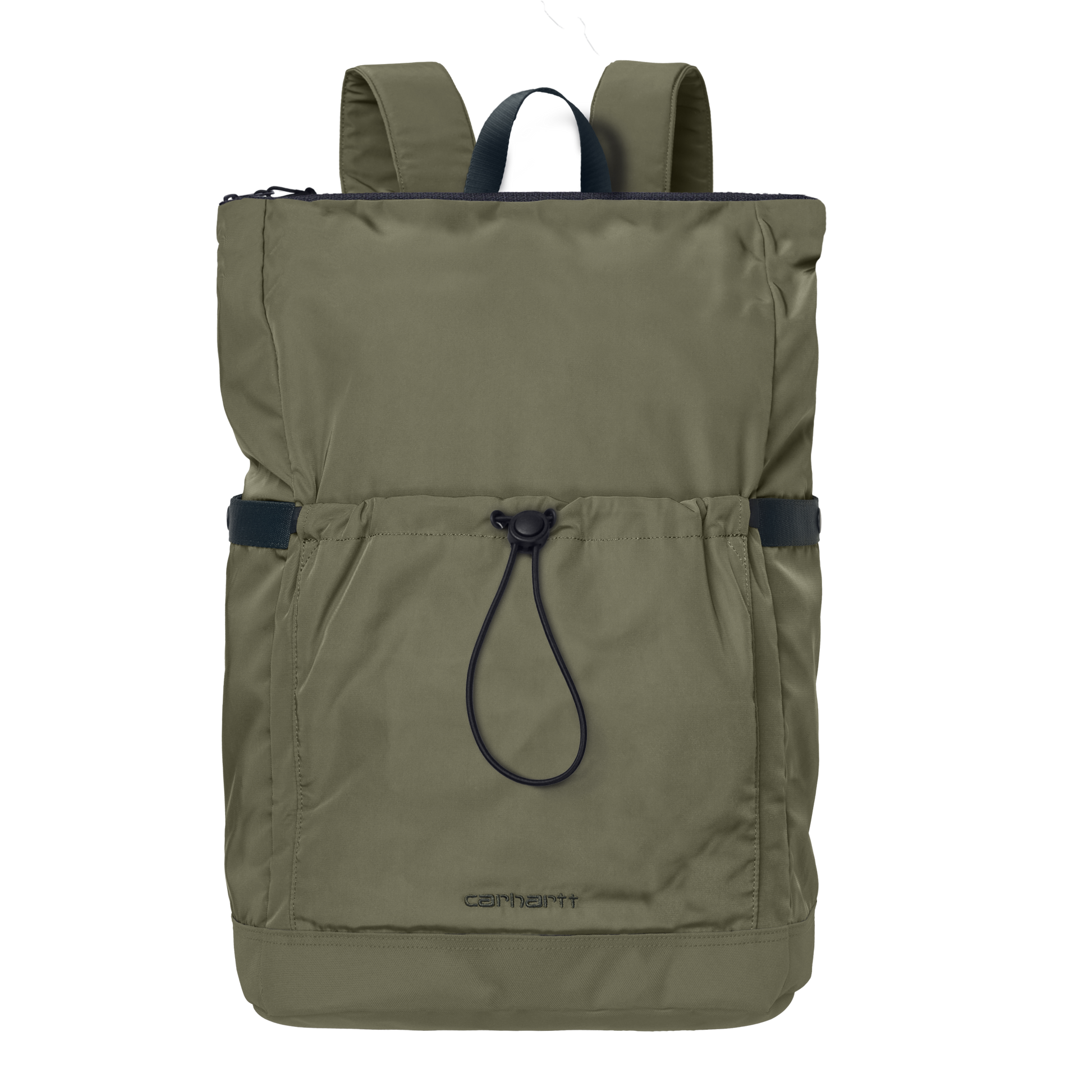 100% Polyester Twill, 196 g/m? 46 x 29 x 16 cm / 18.1 x 11.4 x 6.3 inch 25 liter water repellent fabric lined main compartment with zip closure front pocket with adjustable elastic and stopper side pockets vertical back pocket with zip closure