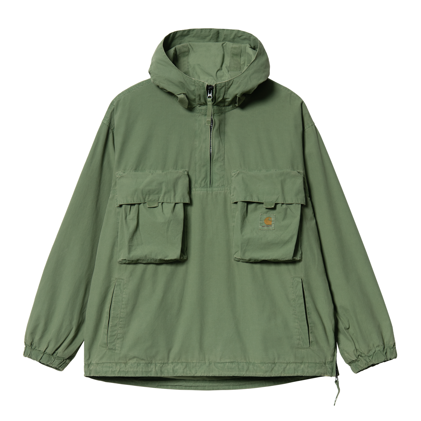 100% Cotton Poplin, 4.4 oz garment dyed cotton poplin lined adjustable hood, cuff and bottom band embroidered eyelet at hood, armhole, pocket and bottom band two chest pockets with velcro closure side opening with zip closure square label