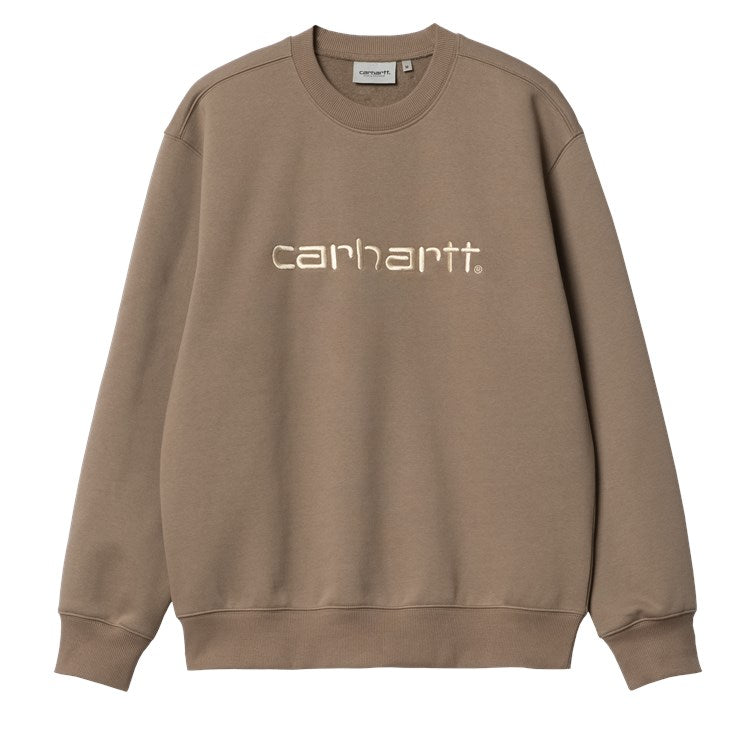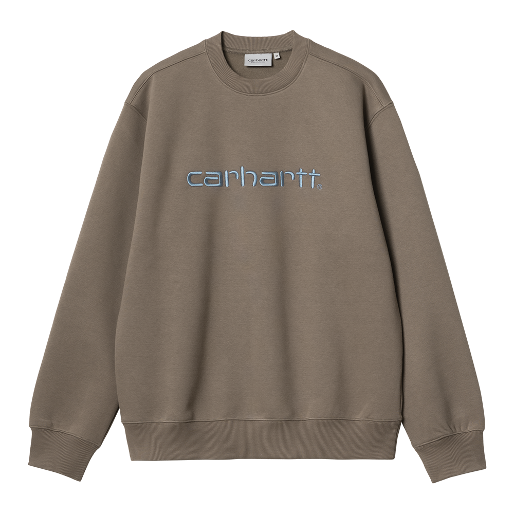 The Carhartt Sweatshirt is made in a loose fit from heavyweight cotton-poly jersey fabric, which has been brushed for a fleece-like backing. It also features a ribbed collar, hem and cuffs. An embroidered Script Logo appears across the chest.