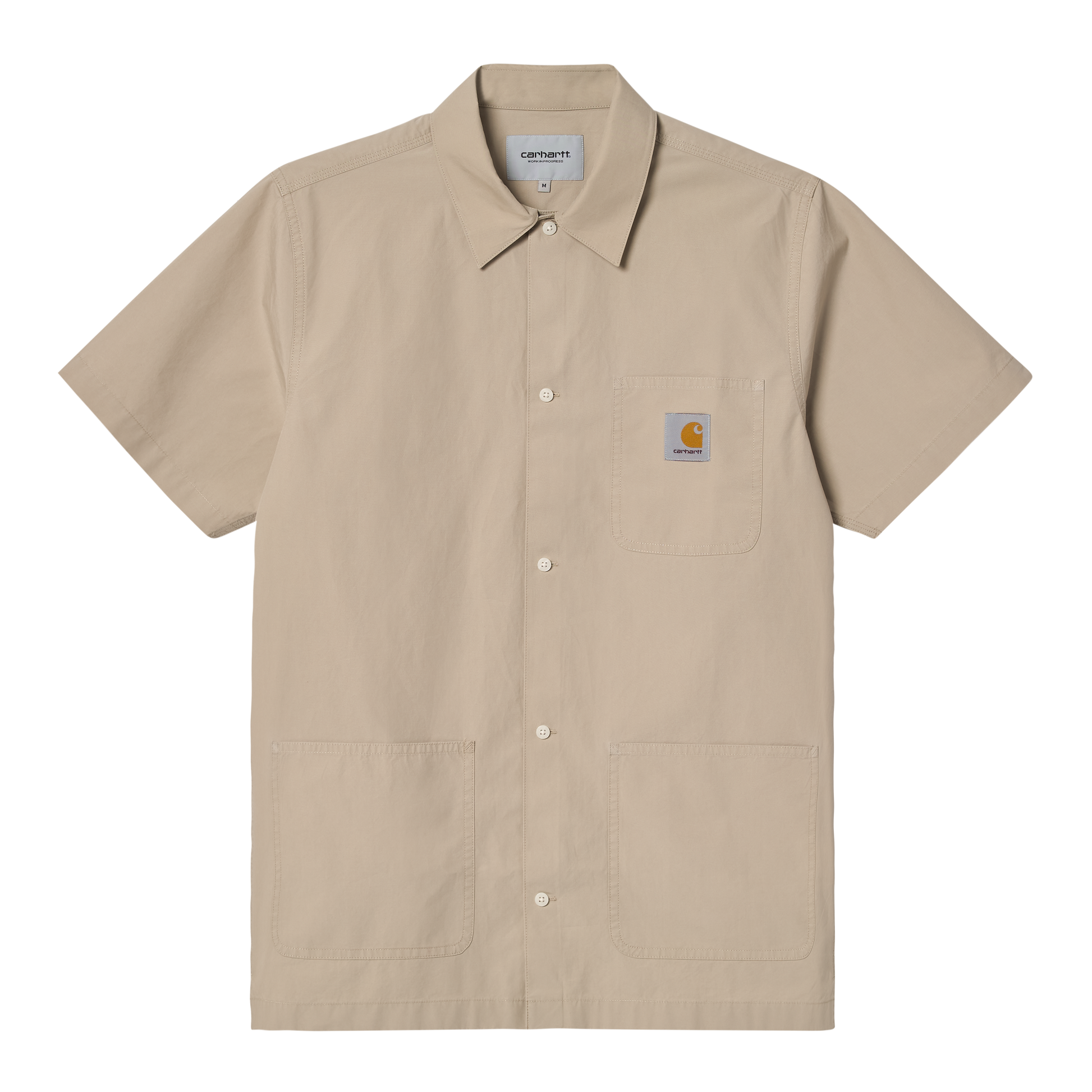 100% Organic Cotton Poplin, 4.1 oz regular fit garment washed recycled polyester buttons chest pocket two front bottom pockets square label WIP script label