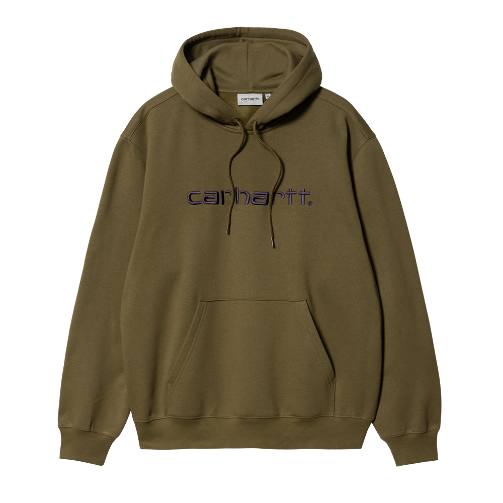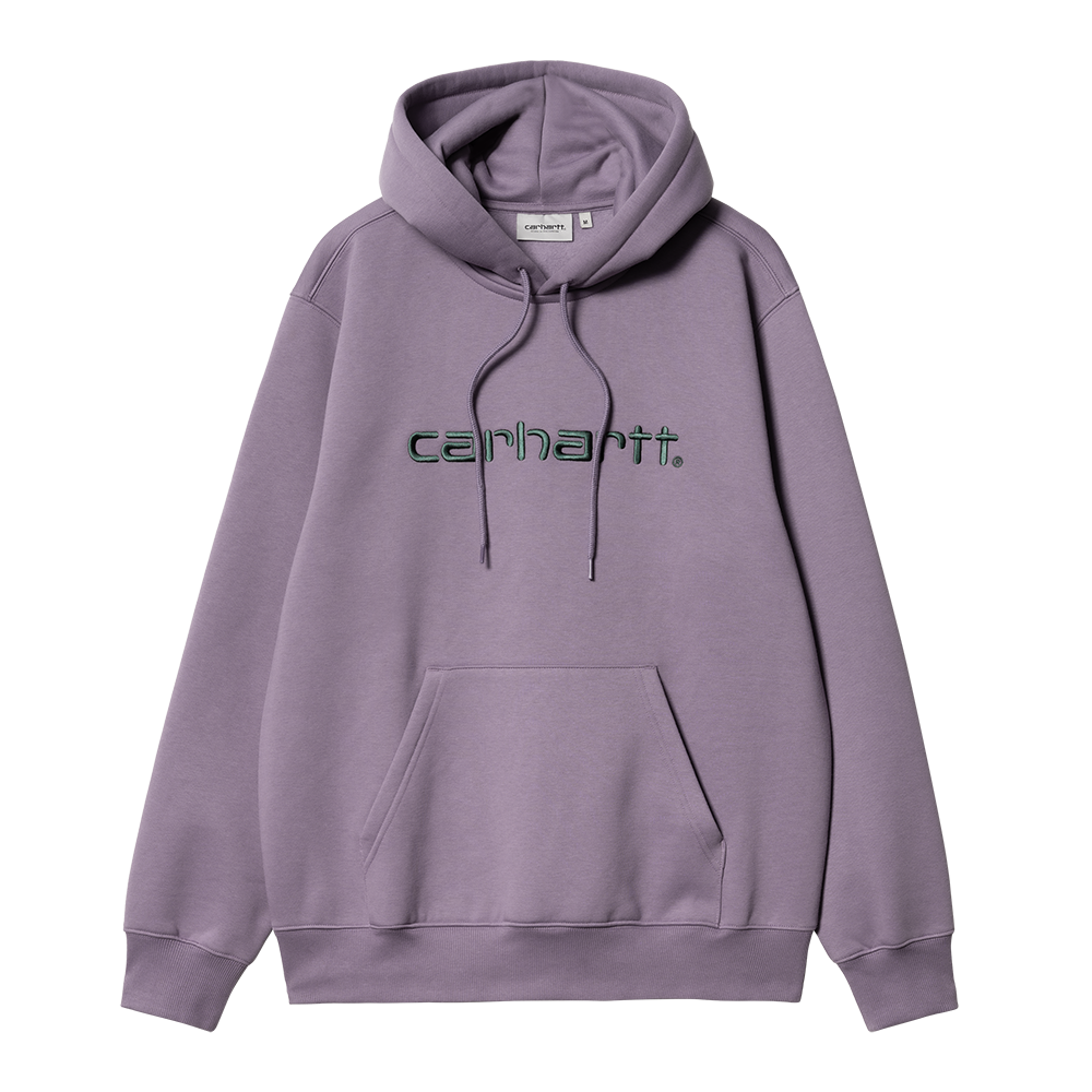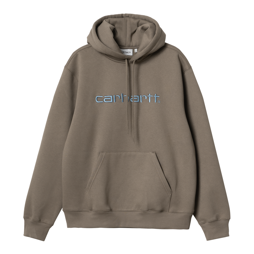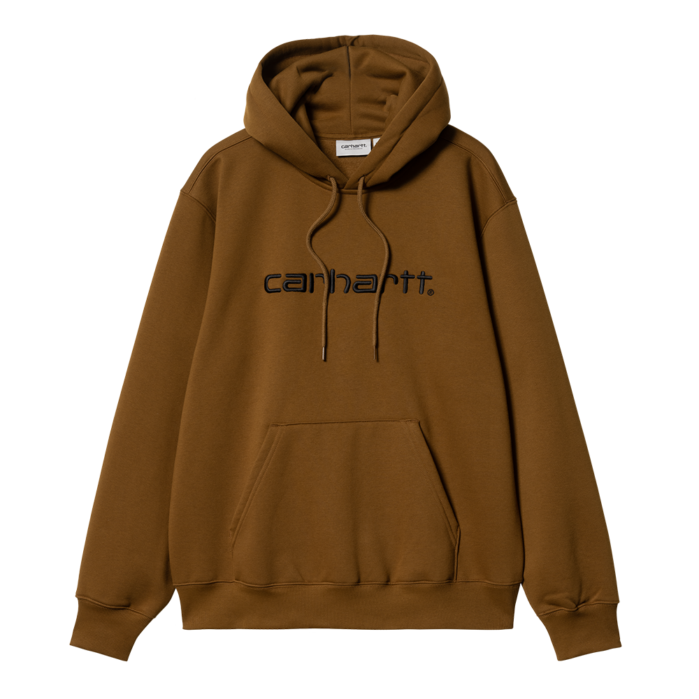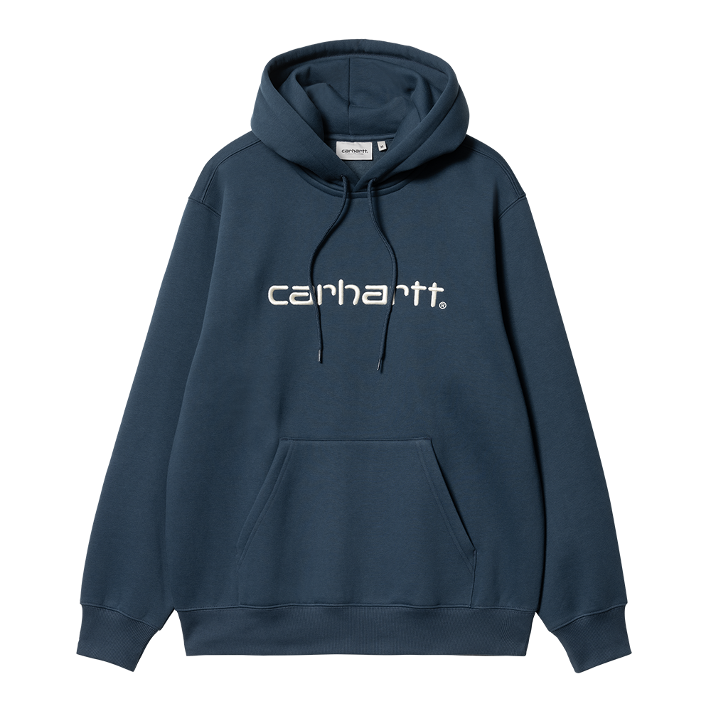The Hooded Carhartt Sweatshirt is made in a loose fit from heavyweight, brushed polycotton jersey, meaning it has a soft fleece-like backing. It also features a kangaroo pocket, as well as a ribbed hem and cuffs. An embroidered Script Logo appears on the chest.