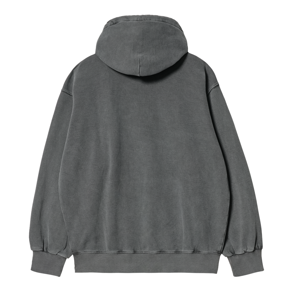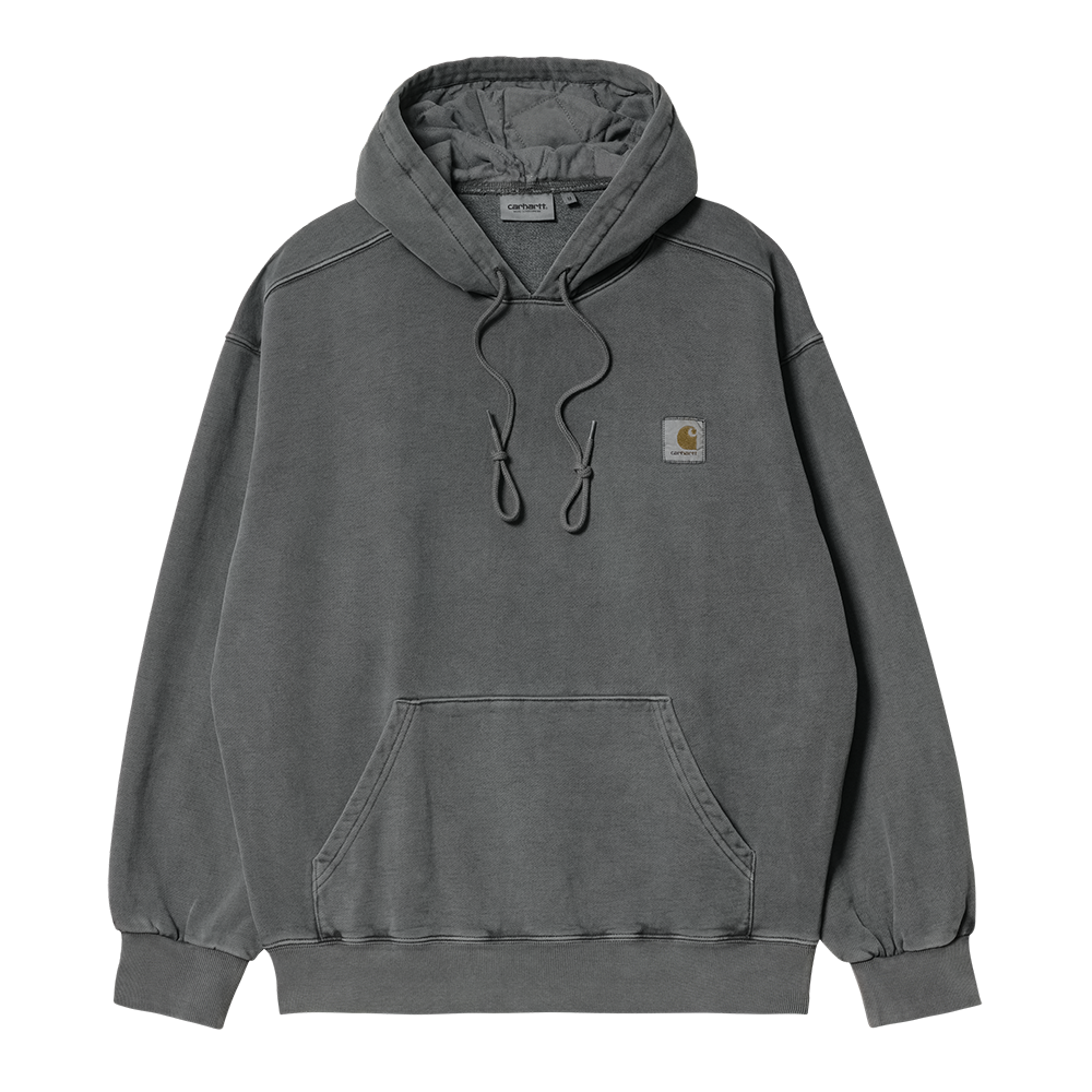 The Hooded Vista Sweatshirt is constructed from heavyweight cotton jersey, which has been brushed for a fleece-like backing. This style is cut in a balloon fit, which is a little looser and boxier, but also characterized by dropped shoulders and ribbed trims. Additionally, the style has been garment-dyed, giving it a washed yet saturated hue. A quilted and adjustable hood offers insulation, and a woven Square Label, rendered murky by the garment-dyeing process, appears on the left chest.