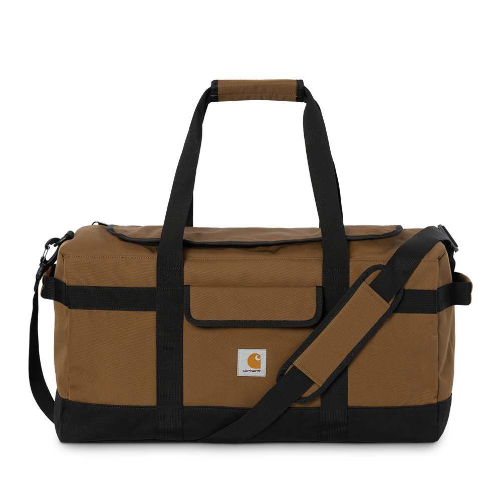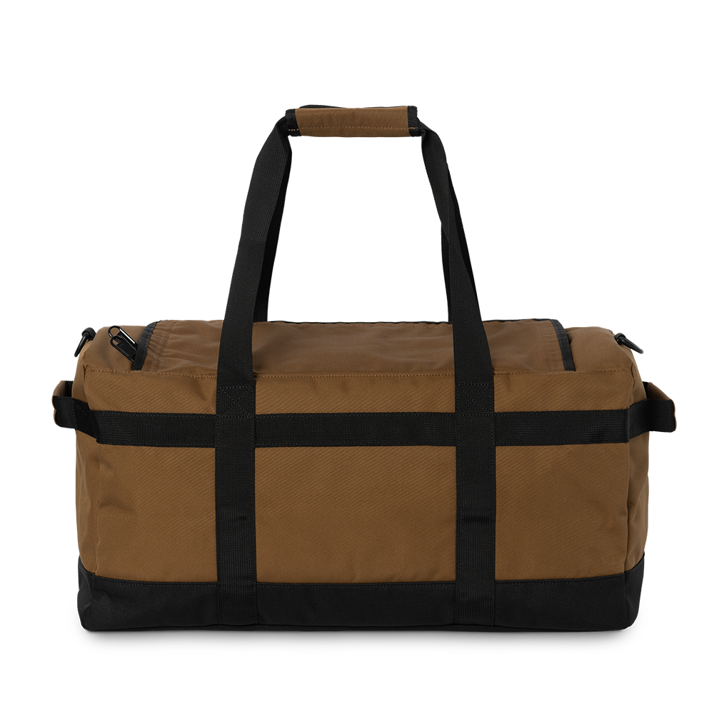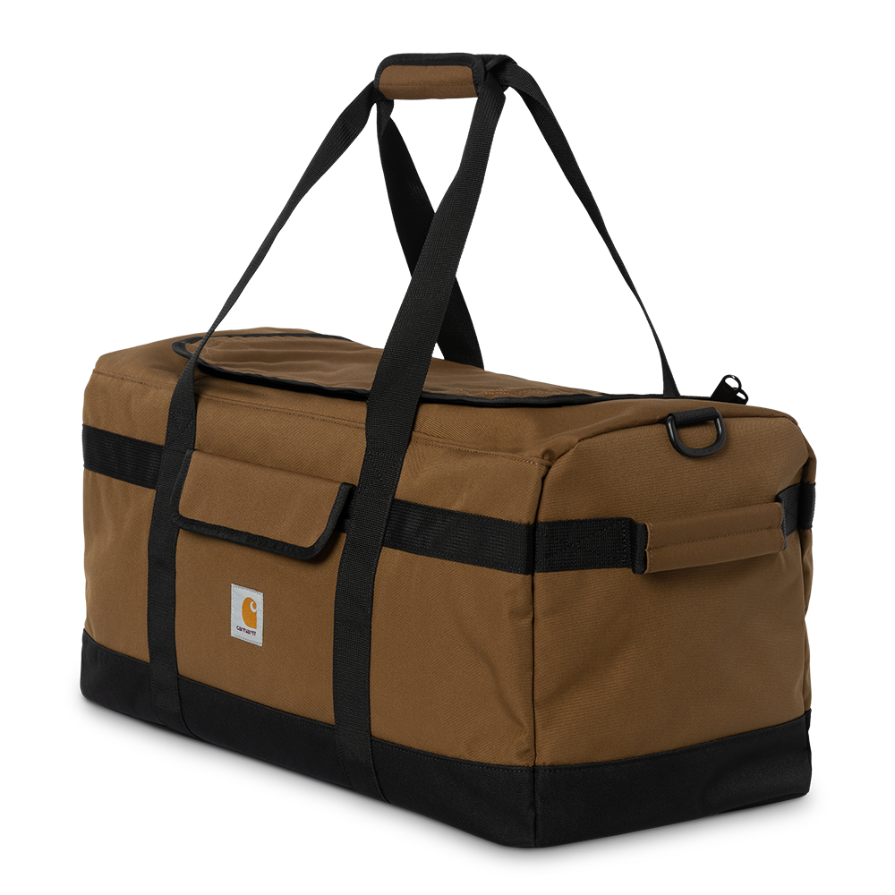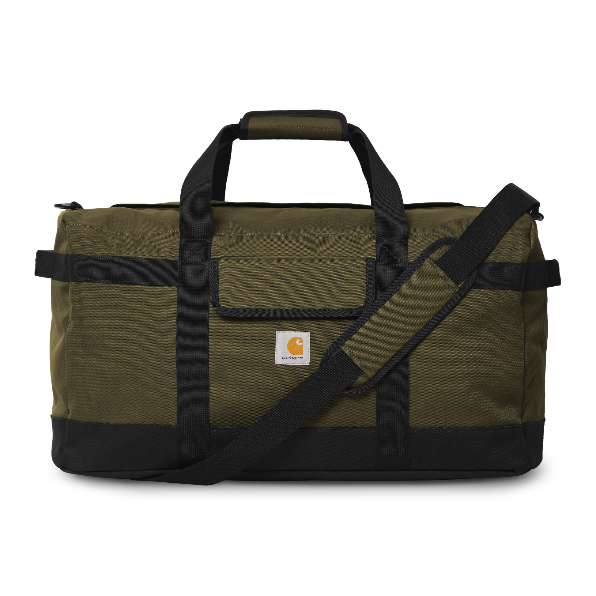100% Recycled Polyester Canvas, 11.25 oz 53.5 x 24 x 26 cm / 21 x 9.4 x 10.2 inch 32 liter water repellent fabric unlined binding at all inside seams main compartment with two-way zip closure front flap pocket with velcro closure handle straps at each side