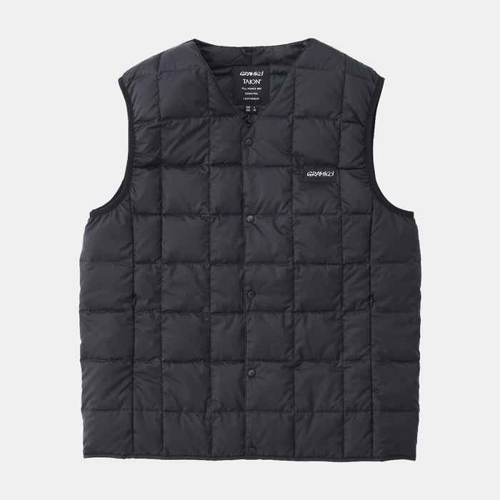 Style Number: G2FU-J083-TG Versatile, warm down material Made from Ripstop Material - Polyester 100% and Down Material - Nylon 100% Zippered side pockets and snap button front closure Repels light rain Layerable under outerwear or over various tops This piece by Gramicci and Taion is great for women and men. This Inner Down Vest can be layered over t-shirts and hoodies or under various outerwear. This lightweight vest is warm and water-resistant, which makes it a great outdoor vest in addition to everyday wear on the town. This packable vest is made with ripstop material, which increases its durability. This vest packs into a small storage bag, making it a great vest for backpacking, camping, or other outdoor activities. With 95% down and 5% feathers, we use light and resilient filling with 800 fill power or more. This down vest can be washed at home without additional care needed.