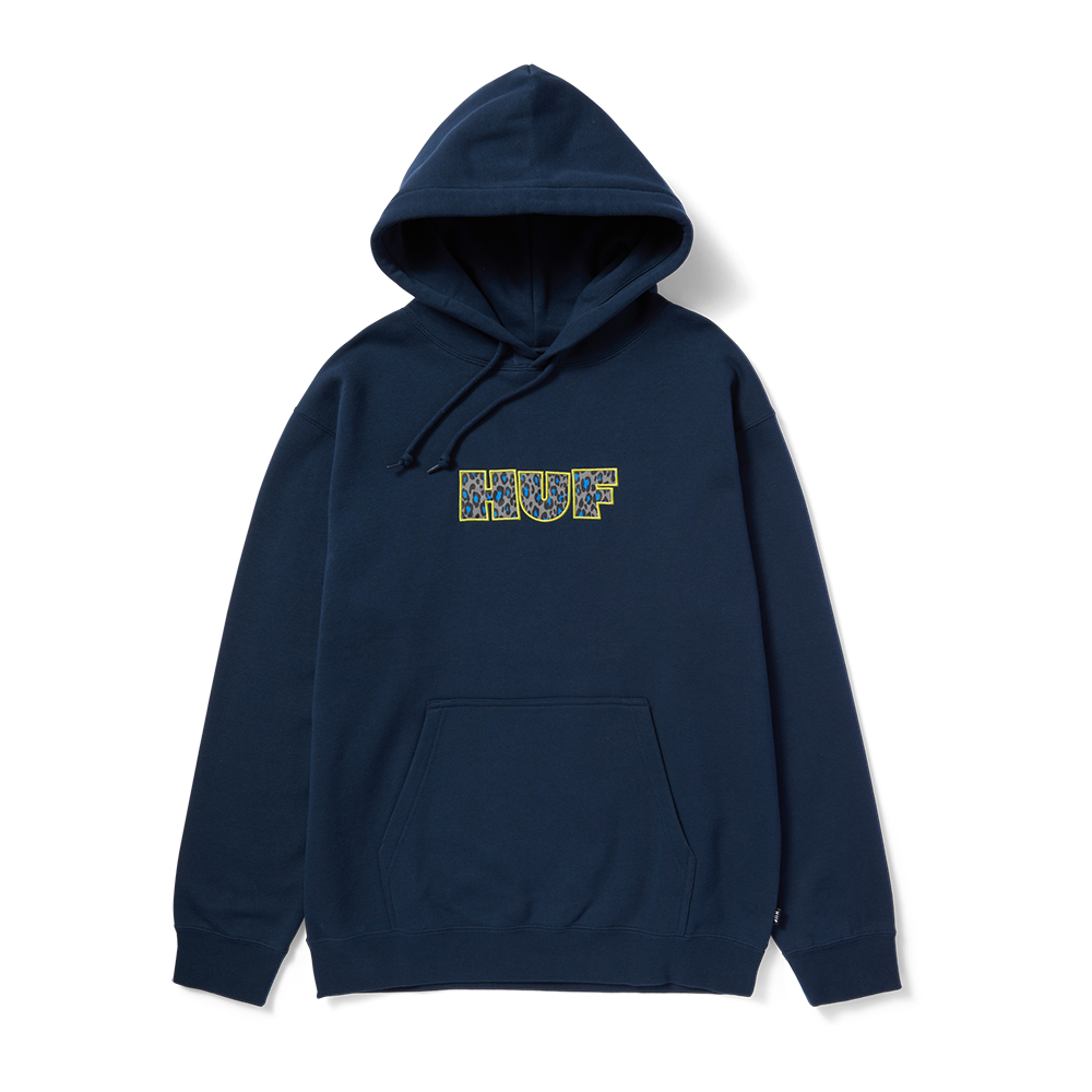• 80/20 cotton-poly 330gm pullover hoodie • Merrowed edge applique artwork w/ printed details at center chest • HUF woven label at interior neck