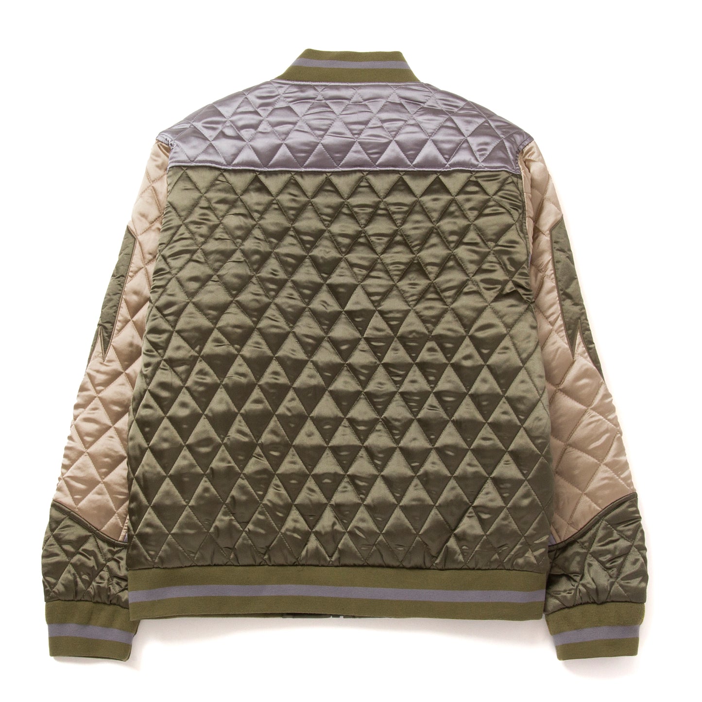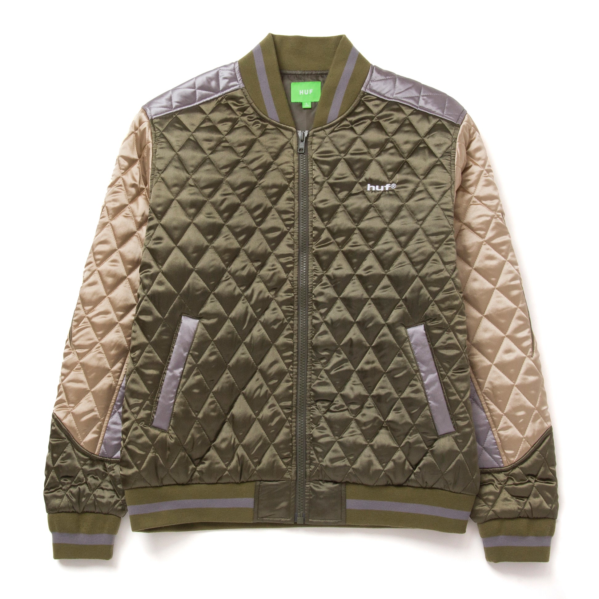 The Lightning Bomber Jacket is offered up in a retro color-blocked silhouette with diamond quilting and a lightweight fill to keep you warm through cooler weather. Featuring a full-zip front for easy layering, the jacket is finished with lightning bolt appliqués at the sleeves, an embroidered HUF logo at the left chest, and striped rib-knit trims. - 97% polyester/ 3% spandex quilted bomber - Insulated poly-fill and taffeta interior lining - Color-blocked paneling - Lightning bolt appliqué patch at sleeves - Embroidered HUF logo at left chest - Full-zip front - Welt handwarmer pockets and interior pocket - 1x1 yarn-dyed rib-knit collar, cuffs, & hem - HUF woven label at interior neck