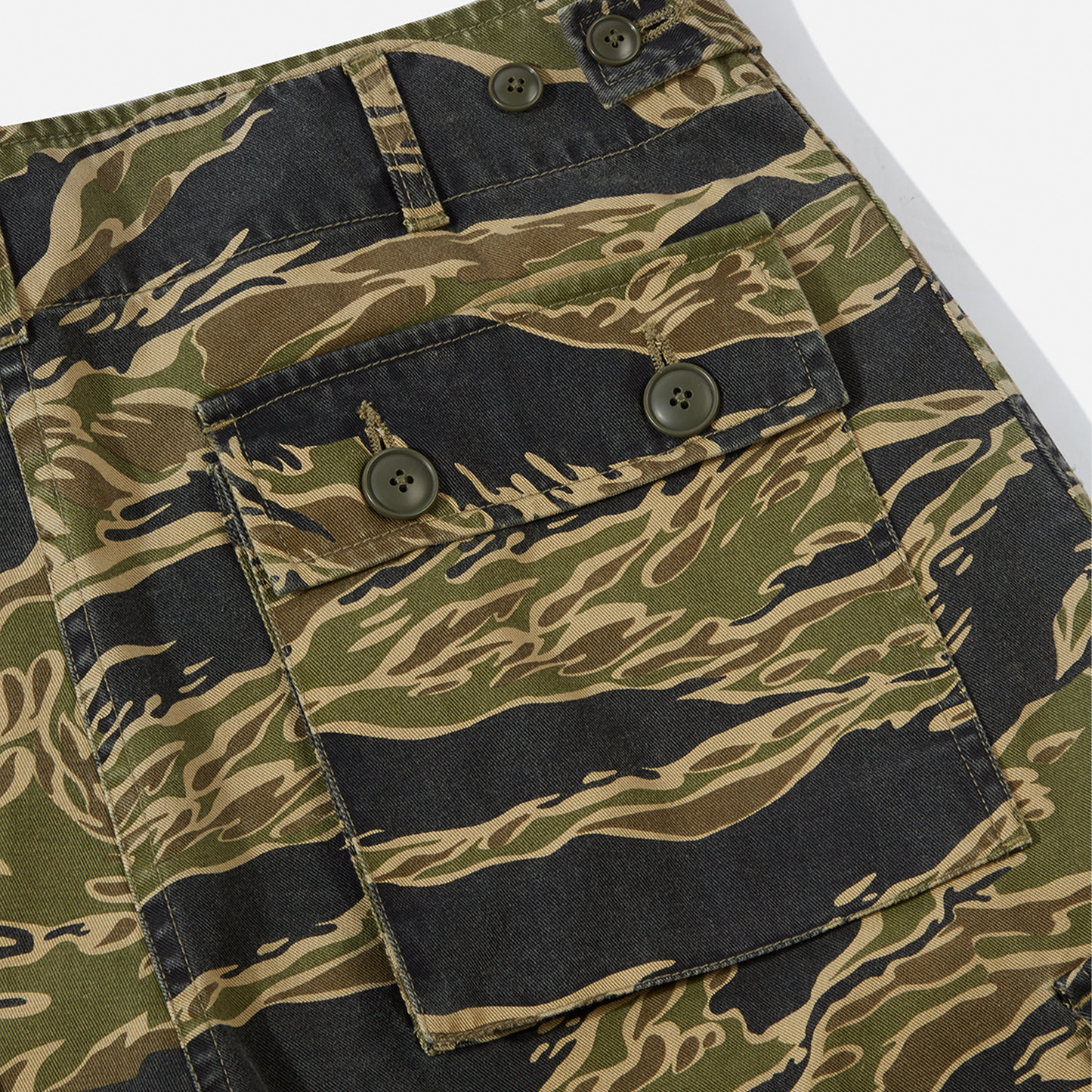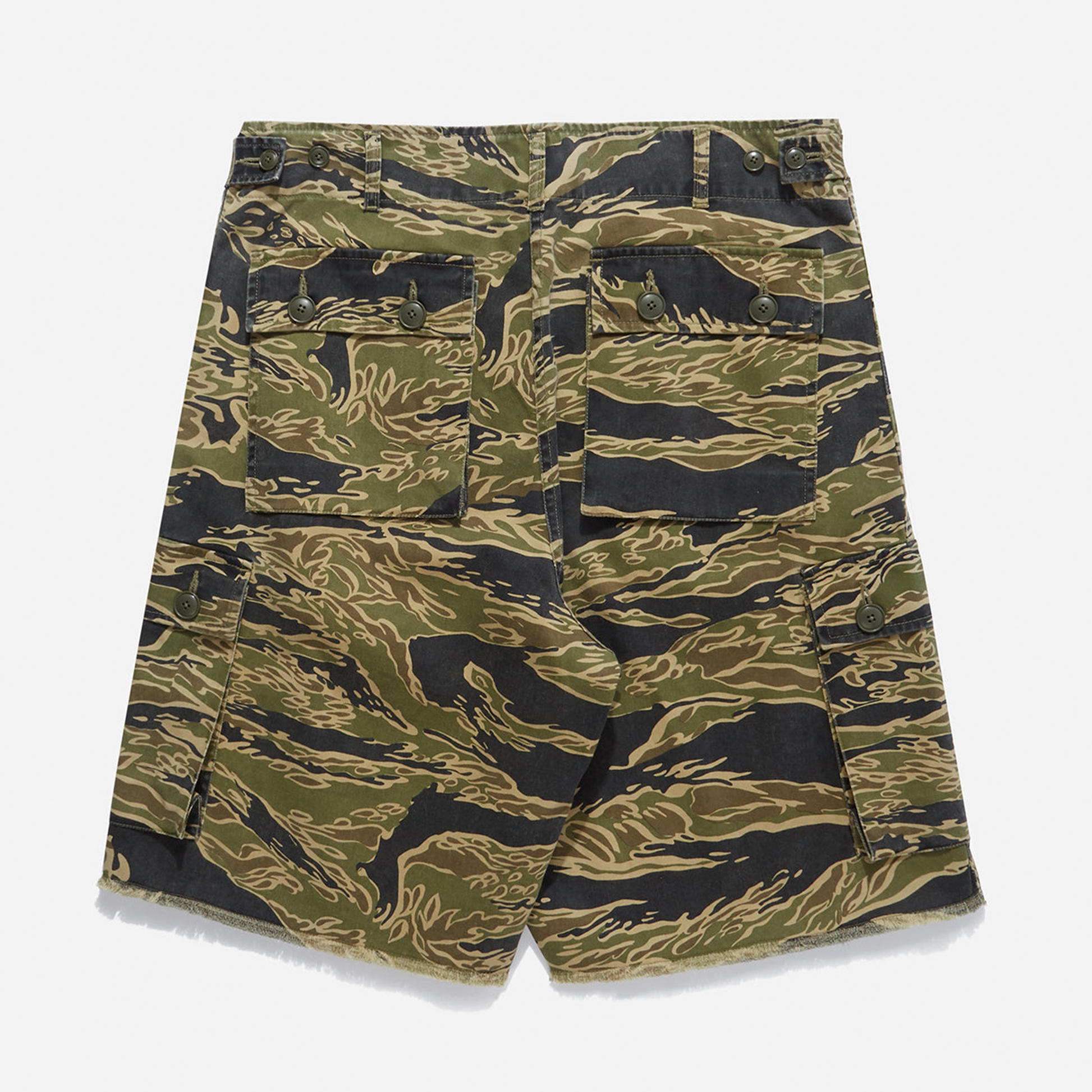 Camo cargo shorts feature DPM: Tigerskins and are made from a 220gsm cotton twill. Cut with a loose fit, knee length with raw edge hems. Referencing U.S. uniforms of the Vietnam war, local tailor shops would be employed to refashion their U.S. issued garments from the grailed tigerstripe camouflage as a sign of their solidarity with the ARVN. Buttoned pocket closures Raw edge hems Belt loops Cool wash & iron or dry clean in solvent, do not tumble dry