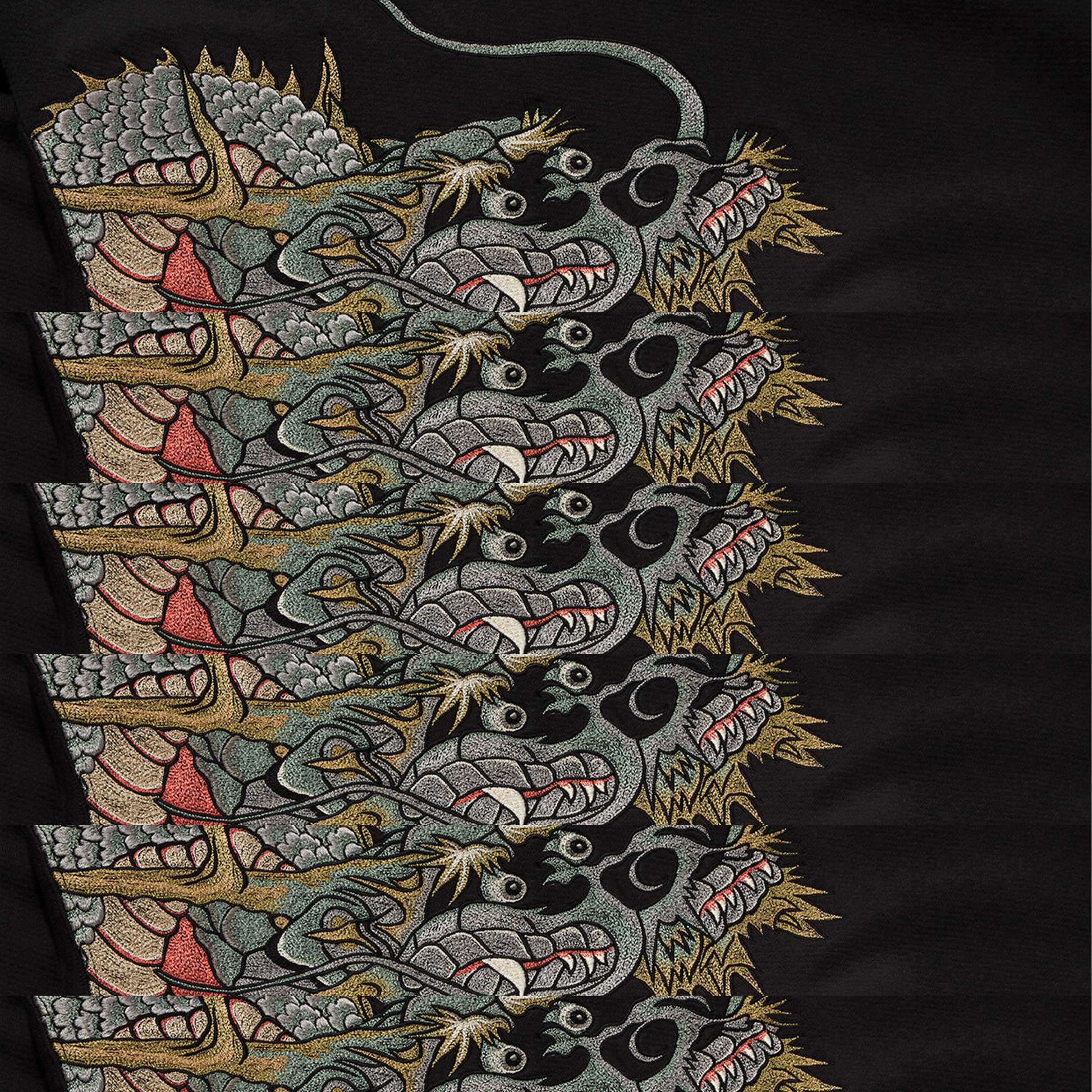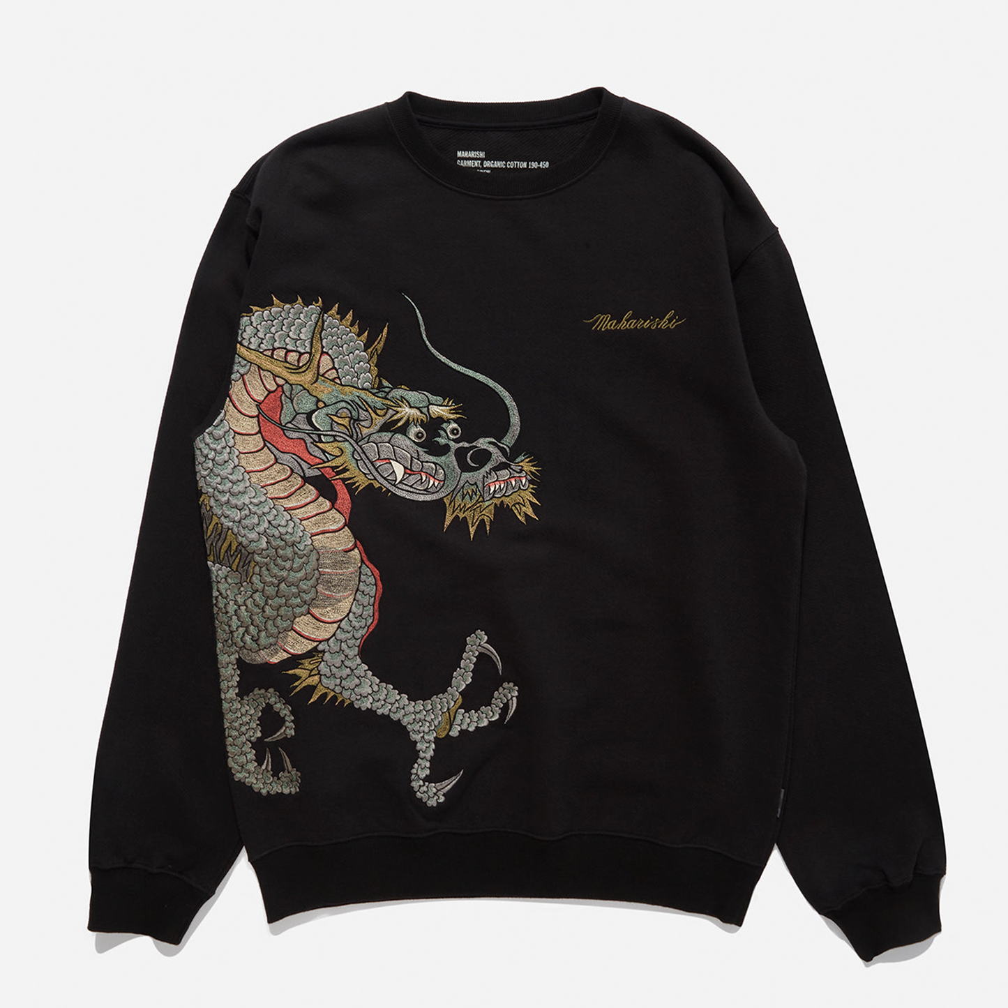 Guest Artist: Utagawa Sadahide · Embroidered Organic cotton crew sweat is cut to a relaxed fit and features an intricate free-hand machine embroidery by late Edo period artist Utagawa Sadahide. Based on his woodblock prints, the original work depicts a never-ending battle between a dragon and tigers representing the earth and sky. Free-hand machine embroidery Ribbed cuffs, collar and hem Cool wash & iron, do not dry clean or tumble dry 100% Cotton · 190gsm Jersey Maharishi’s perennial use of organic cotton aims to raise awareness and contribute to the reduced use of pesticides in the production of clothing materials.