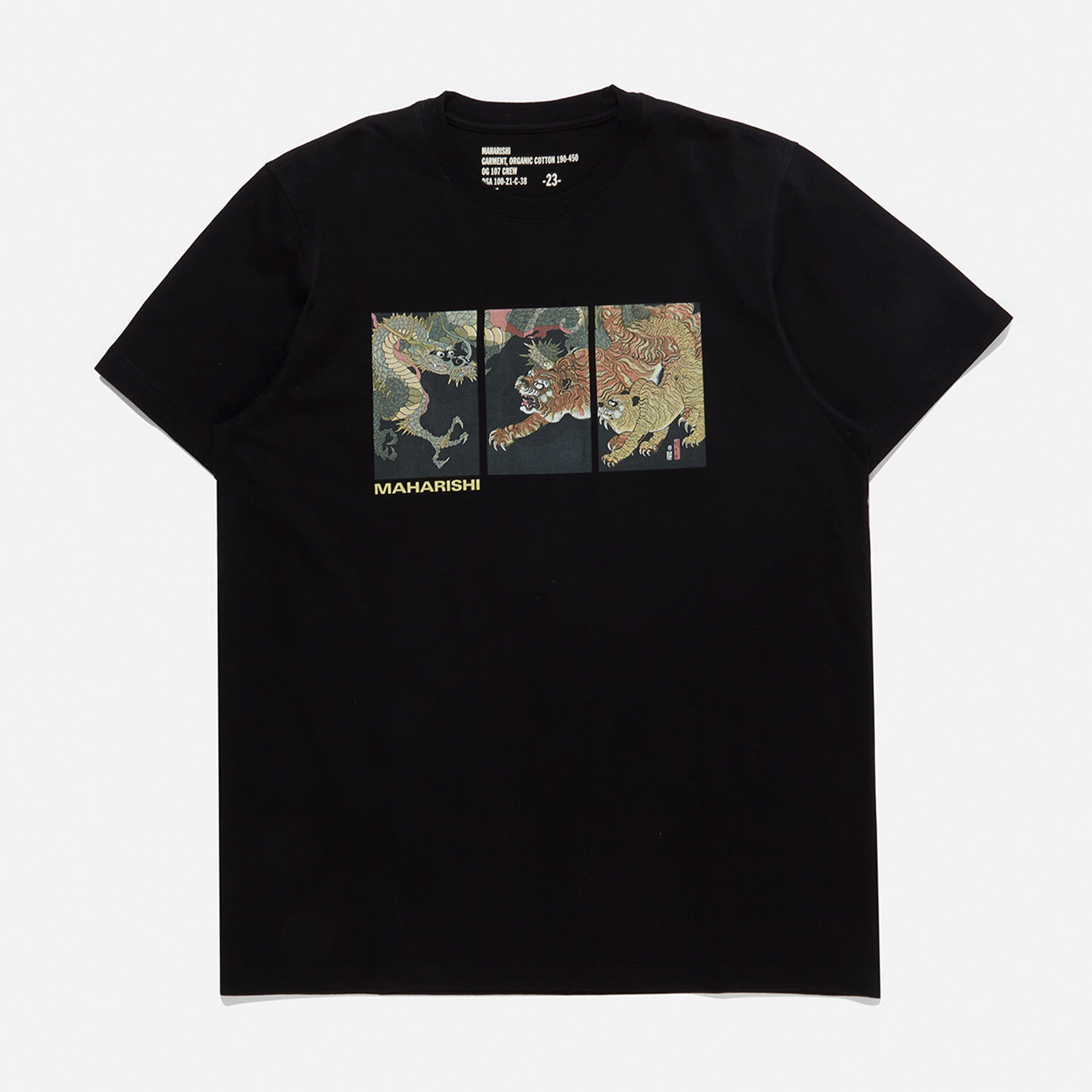 Guest Artist: Utagawa Sadahide A graphic short sleeve tee featuring artwork by late-edo period artist, Utagawa Sadahide. Based on his woodblock prints, the triptych depicts a never-ending battle between a dragon and tigers representing the earth and sky. Chest print Ribbed neck 100% Cotton · 192gsm Jersey Maharishi’s perennial use of organic cotton aims to raise awareness and contribute to the reduced use of pesticides in the production of clothing materials.