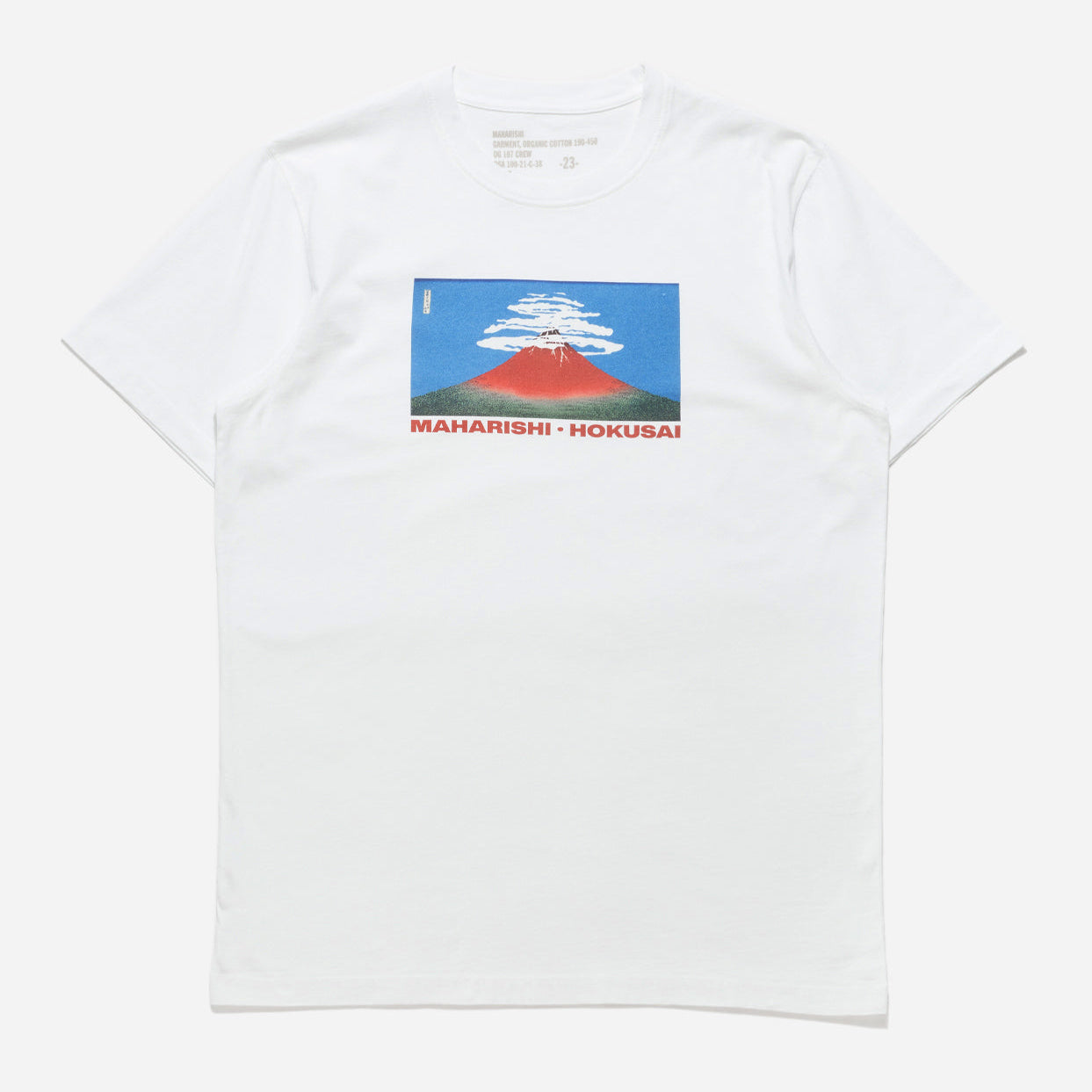 White organic cotton T-Shirt, featuring chest print from Hokusai's "Thirty-six Views of Mount Fuji". Red Fuji Print Ribbed neck "Thirty-six Views of Mount Fuji" by Katsushika Hokusai is highly regarded as one of the world's greatest series of images of various vantage points. This series is noted for its particular blue colour, called "Berlin indigo" (bero-ai), a pigment newly introduced in Japan by Dutch merchants. Organic Cotton Jersey 190gsm · 100% Cotton The perennial use of organic cotton aims to raise awareness and contribute to the reduced use of pesticides in the production of clothing materials. Every Maharishi collection utilises sweat and jersey grown without toxic pesticides or synthetic fertilisers.