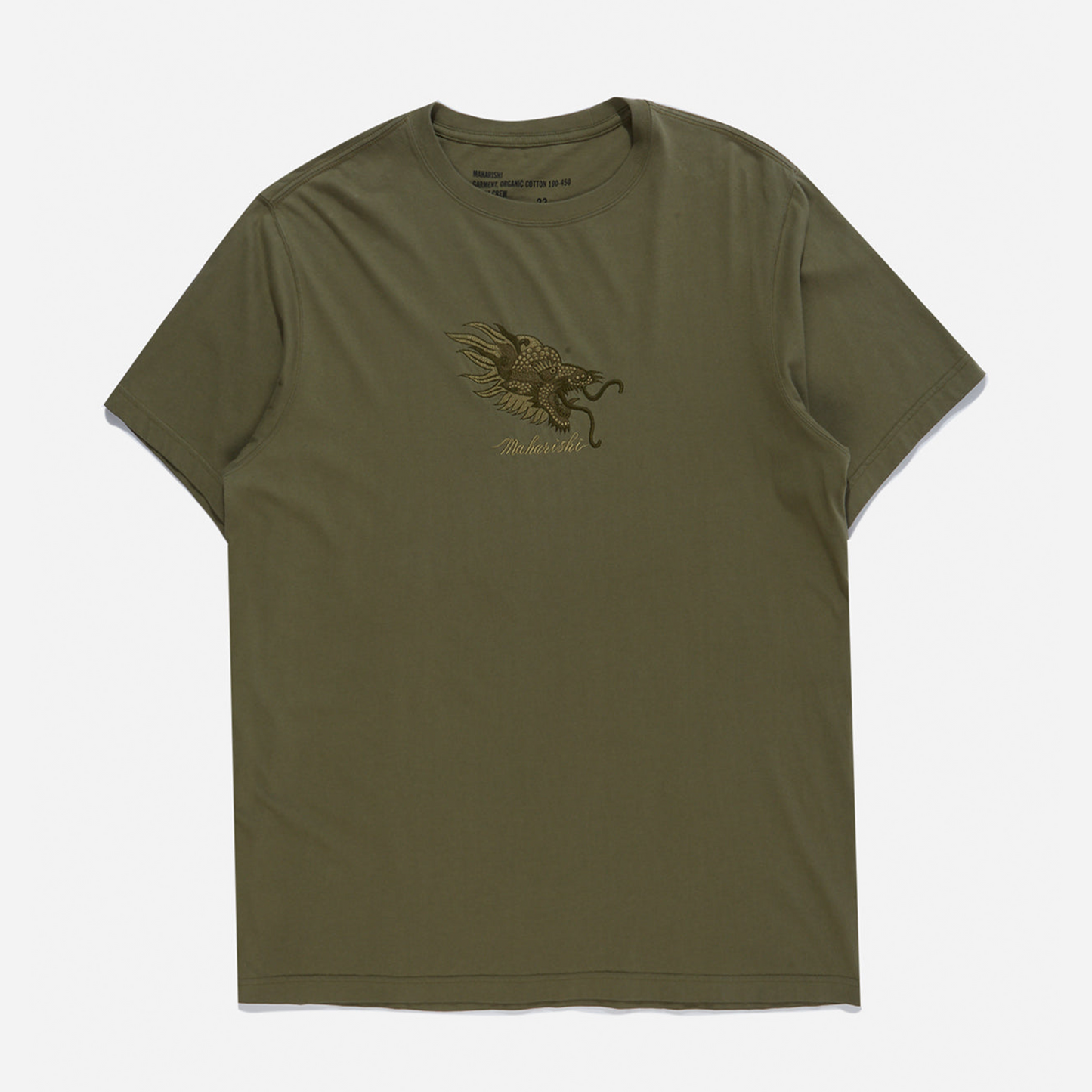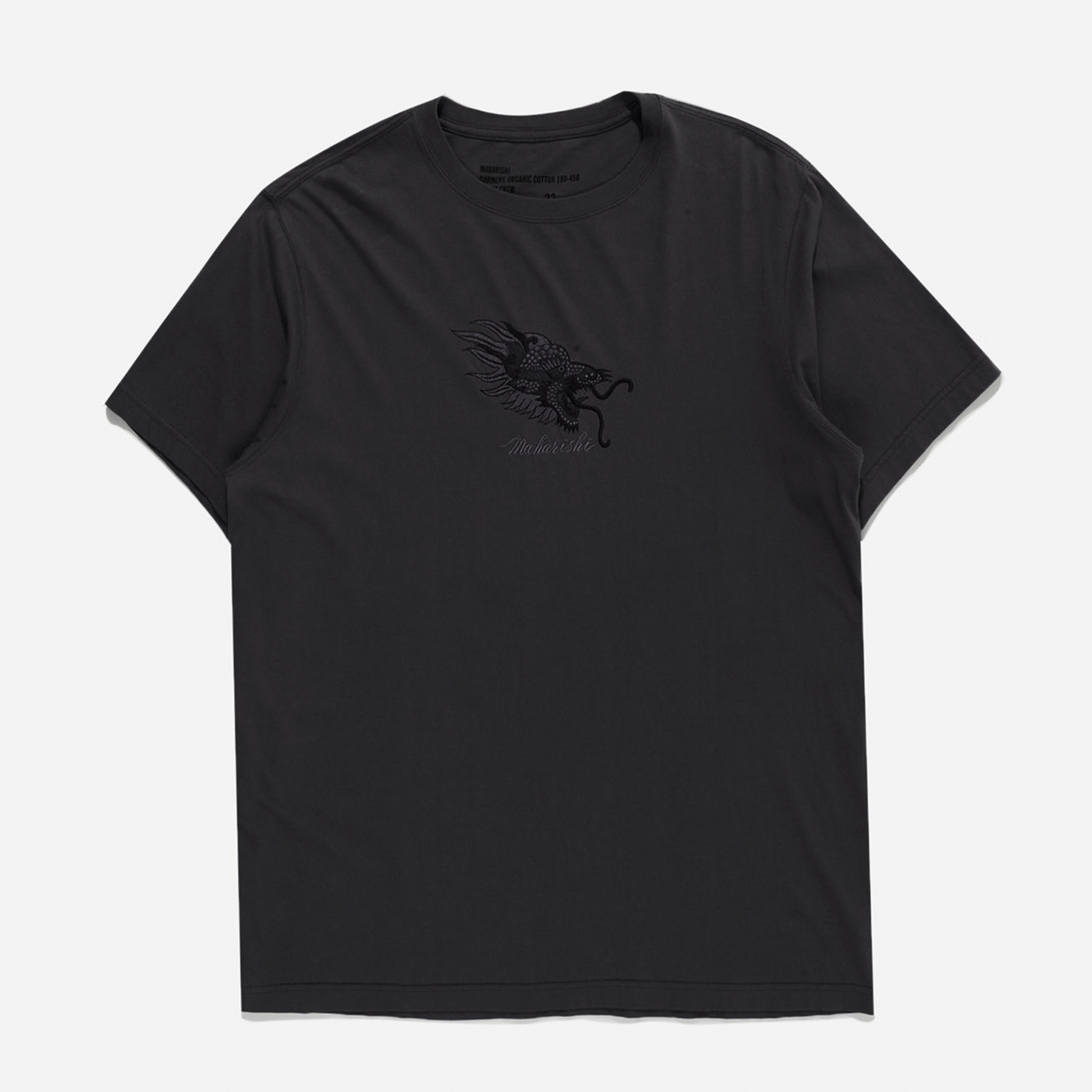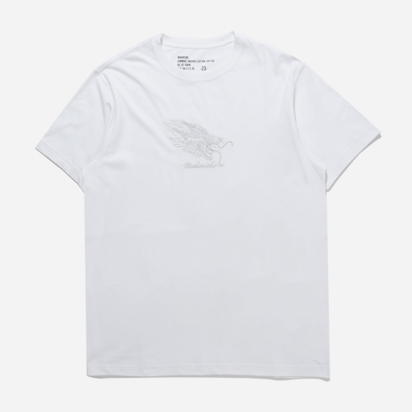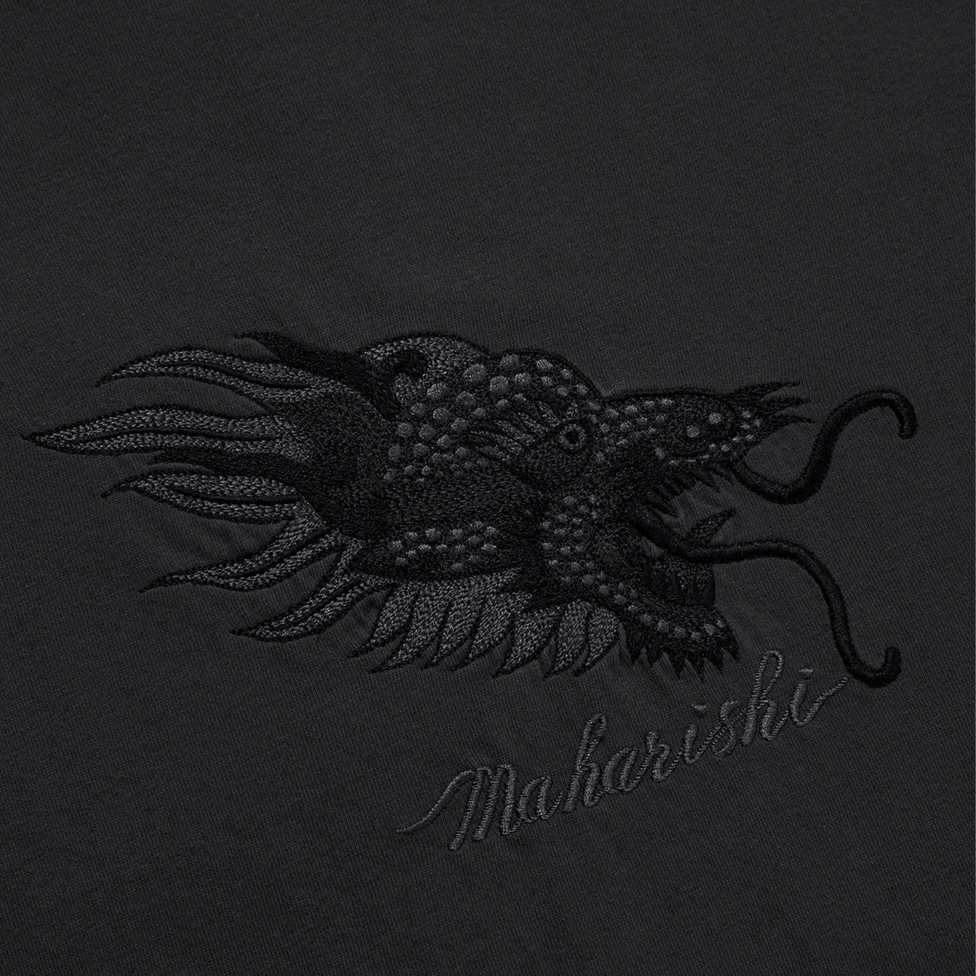 Tonal Dragon Embroidery · Vintage Stonewashed Short sleeve T-Shirt features a tonal hand-machined embroidery, made from a soft organic cotton jersey and cut to a relaxed fit. Hand machined embroidery Ribbed neck Cool wash & iron, do not dry clean or tumble dry 100% Cotton · 190gsm Jersey Maharishi’s perennial use of organic cotton aims to raise awareness and contribute to the reduced use of pesticides in the production of clothing materials.