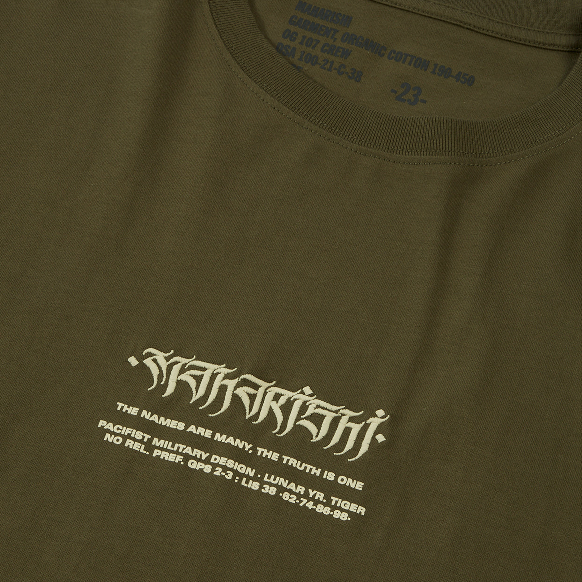 Calligraphy Print & Embroidery · Calligraphy by @Solo_Cink Short sleeve T-Shirt features a Tibetan script MILTYPE chest embroidery and print. constructed from an organic cotton jersey and cut to a relaxed fit. MILTYPE chest embroidery and print Ribbed neck 100% Cotton · 190gsm Maharishi’s perennial use of organic cotton aims to raise awareness and contribute to the reduced use of pesticides in the production of clothing materials.