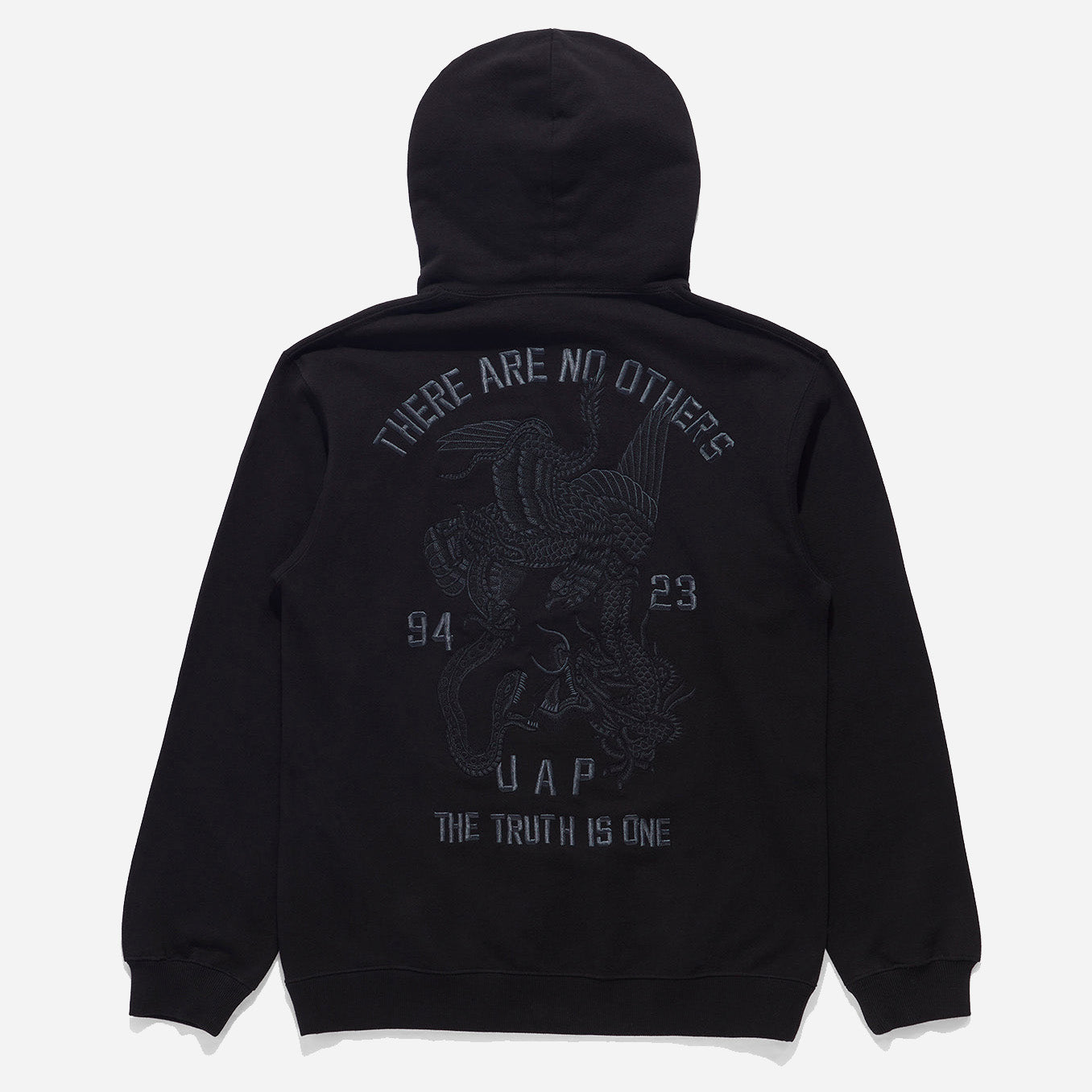 Heavyweight hooded sweatshirt in black cut to a relaxed fit, finished ribbed cuffs and hem featuring a hand-machined Battle Royale embroidery on the reverse and on hood. Hand-machined Battle Royale embroidery Drawcord hood Ribbed cuffs and hem Cool wash, no bleach, cool iron, do not dry clean, do not tumble dry Battle Royale is often seen in ancient artworks, depicting the Dragon, Eagle, and Snake intertwined in eternal battle. Which represent the forces of good and evil in Japanese mythology. Organic Cotton Sweat 450gsm · 100% Cotton The perennial use of organic cotton aims to raise awareness and contribute to the reduced use of pesticides in the production of clothing materials. Every Maharishi collection utilises sweat and jersey grown without toxic pesticides or synthetic fertilisers.