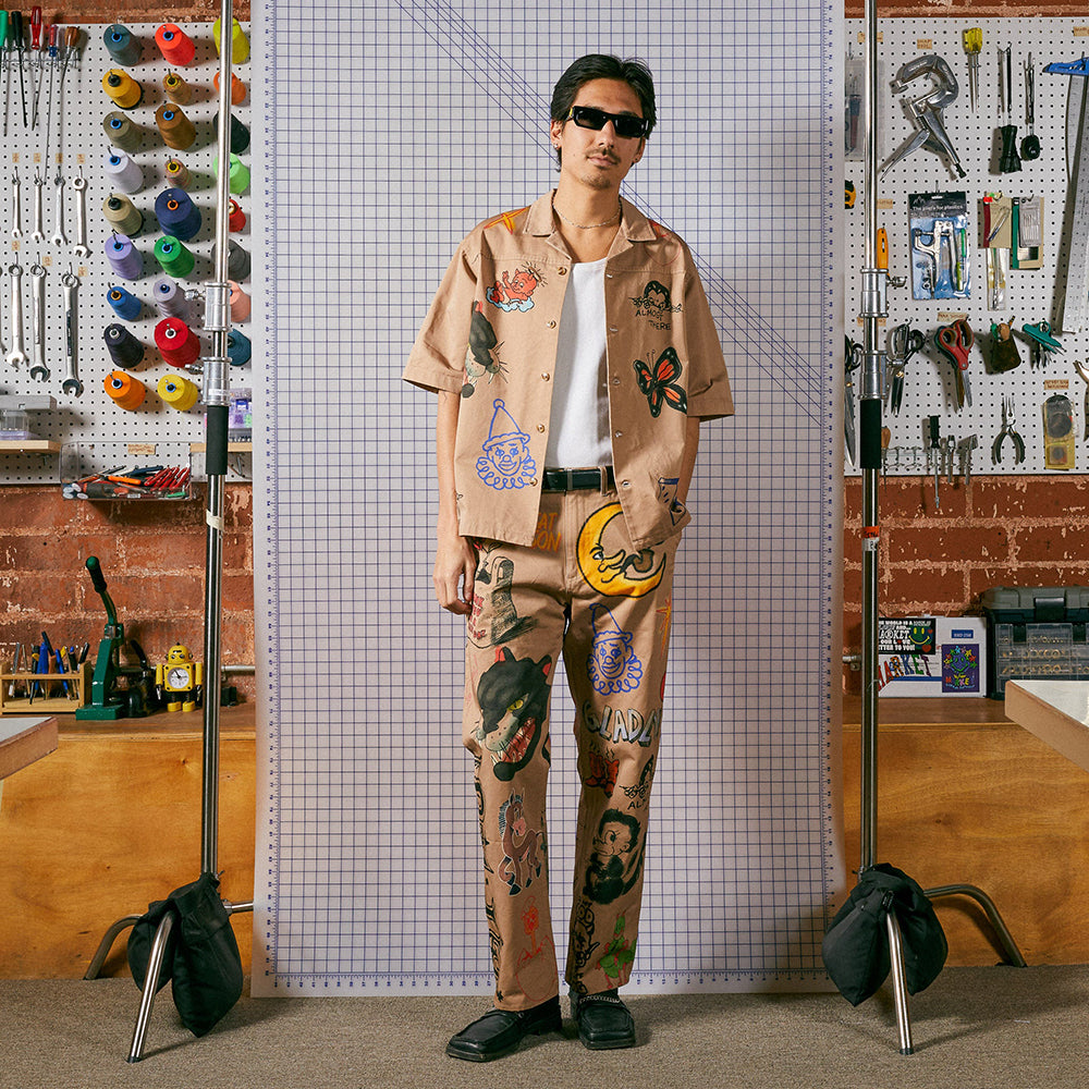 Ok, story time. So back in the day before we used to write in Senior Year Books to wish each other off, kids used to draw-on and write messages to their friends on their pants! The real cool ones used to do it themselves as a way of self expression and was really only a trend for a decade or so through out the mid-west. Truly a special time and unique moment in youth fashion trends. This is our play on that, transformed into a shirt. (If you missed em, we made pants too)