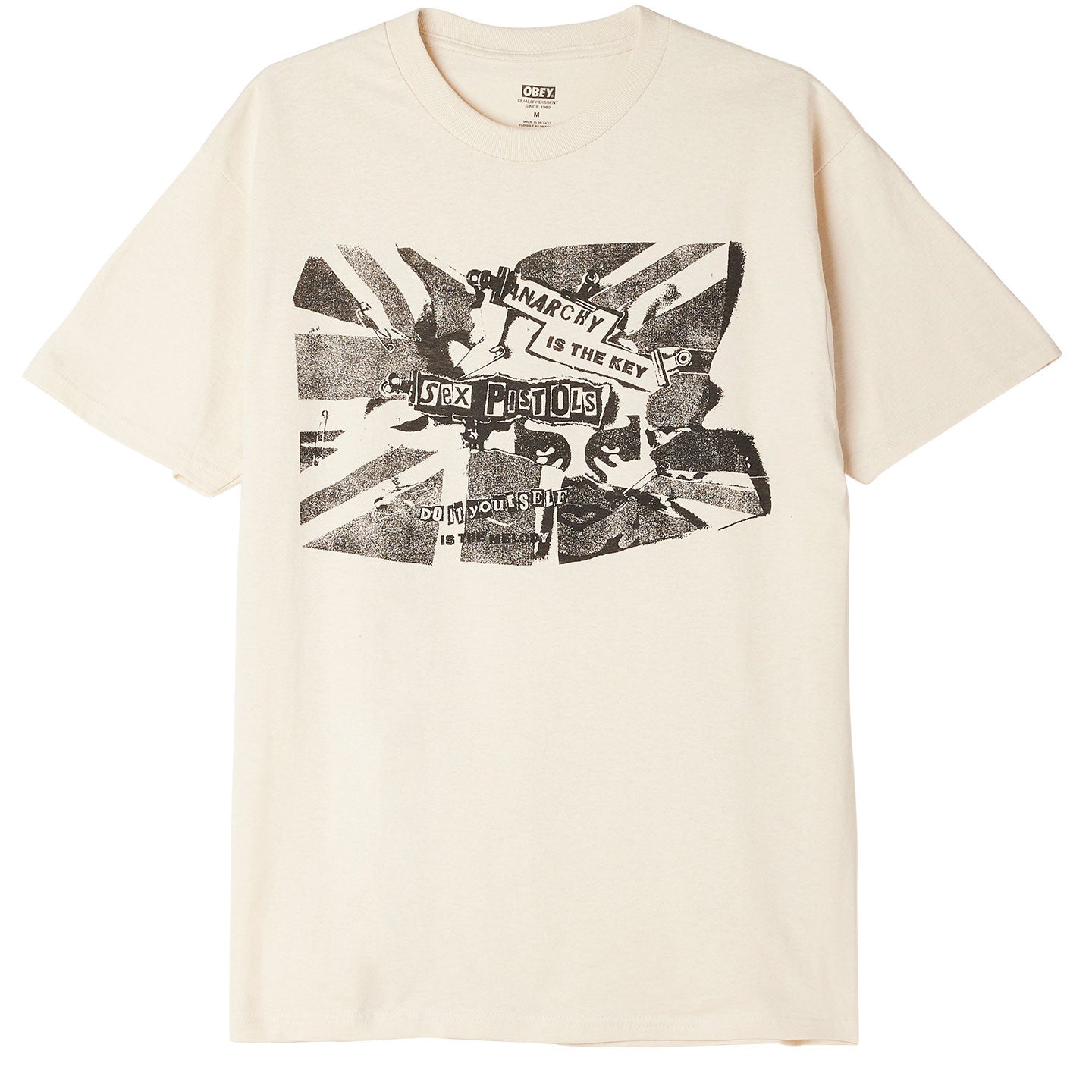 CLASSIC FIT T-SHIRT. 100% COTTON. I VIVIDLY REMEMBER THE FIRST TIME A GOOD FRIEND PUT “NEVER MIND THE BOLLOCKS, HERE’S THE SEX PISTOLS” ON THE TURNTABLE IN HIS BEDROOM. MY ARM HAIRS STOOD UP THE MOMENT I HEARD THE ALBUM OPENER, “HOLIDAYS IN THE SUN,” WHICH STARTS WITH MARCHING BOOTS JOINED BY DRUMS AND OMINOUS POWER CHORDS WITH JOHNNY ROTTEN SNARLING INTO THE LYRIC “A CHEAP HOLIDAY IN OTHER PEOPLE’S MISERY.” THE ALBUM LAUNCHES WITH AWESOME POWER, SURLY DISDAIN, AND NEVER LETS UP, DELIVERING “BODIES,” “ANARCHY IN THE U.K.,” “GOD SAVE THE QUEEN,” AND “PRETTY VACANT” ALONG THE WAY. THE SEX PISTOLS MADE A PERFECT DEBUT ALBUM, AND THEY CHANGED MY LIFE BEFORE I EVEN KNEW THAT THEY HAD CHANGED THE ENTIRE ROCK N ‘ROLL PARADIGM. THE FIRST GROUP THAT GOT ME INTO THE MUSIC SUBCULTURE WAS THE SEX PISTOLS. AT FIRST, I JUST DUG THE MUSIC, BUT AS I LEARNED MORE ABOUT THEM, I REALIZED THAT THEY CREATED AN INCREDIBLE CULTURAL UPHEAVAL AND THAT THERE WERE TALENTED PEOPLE INVOLVED NOT ONLY IN THE MUSIC BUT THE ART, FASHION, AND BUSINESS ENDS. FROM THE AMAZING VENOM OF JOHNNY ROTTEN TO THE GUITAR POWER OF STEVE JONES, TO THE FASHION STYLES OF VIVIENNE WESTWOOD, TO THE GRAPHICS OF JAMIE REID, TO THE MEDIA MANIPULATION OF MALCOLM MCLAREN, THE SEX PISTOLS WERE THE MOST BRILLIANT GROUP OF OUTSIDERS TO SWINDLE THEIR WAY TO THE TOP OF THE ROCK ‘N’ ROLL INDUSTRY. I STUDIED JAMIE REID’S COLLAGE ART AND ABSORBED HIS AUDACIOUS SUBVERSION OF DOMINANT CULTURE’S ICONOGRAPHY. -SHEPARD FAIREY