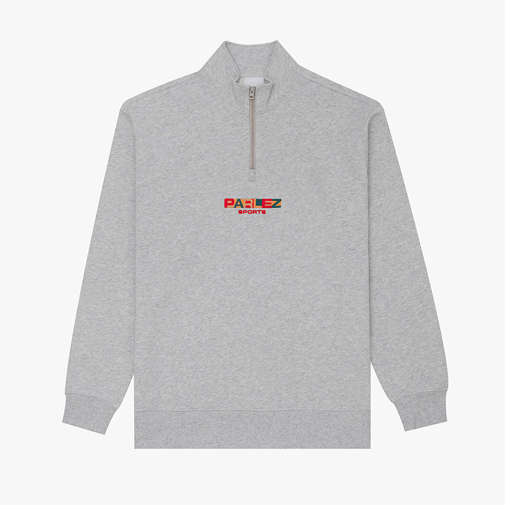 The Ora Quarter-Zip in Heather. A brushed back pullover made from a soft, organic cotton and recycled poly blend. Featuring a stand collar with 1/4 zip placket and ribbed trims. Detailed with an embroidered design on the chest. 80% Organic Cotton | 20% Recycled Poly | Brushed Back Embroidered Design