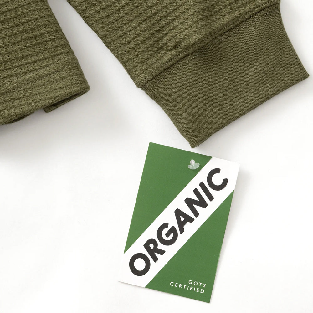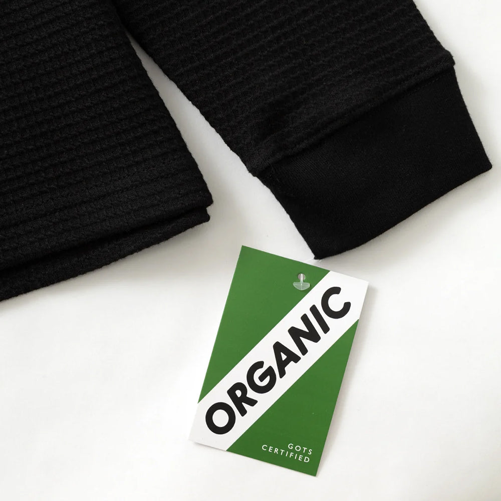 Organic, 8.5oz, 300gsm GOTS certified waffle knit cotton Not too boxy, not too slim Built for all seasons and occasions Heavy-duty, set-in neckline, ribbed cuffs.